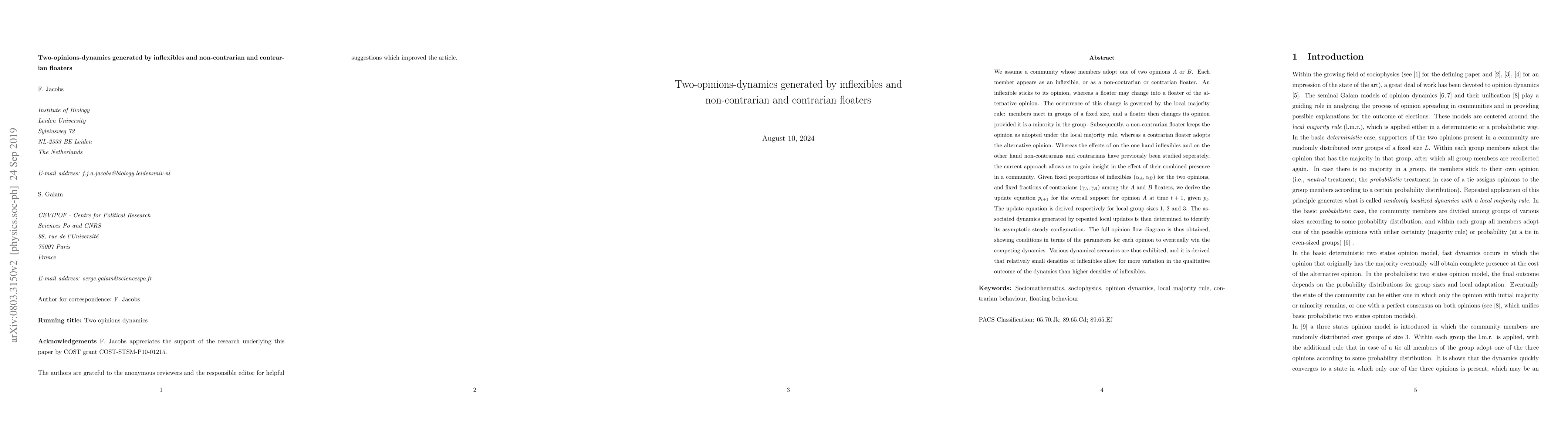 This paper examines opinion dynamics in a community where members adopt one of two opinions, $A$ or $B$, and can be inflexible, non-contrarian floaters, or contrarian floaters. It derives update equations for opinion support under local majority rules and identifies the asymptotic steady configurations of the dynamics, revealing that lower densities of inflexibles allow for more variability in the outcome compared to higher densities.