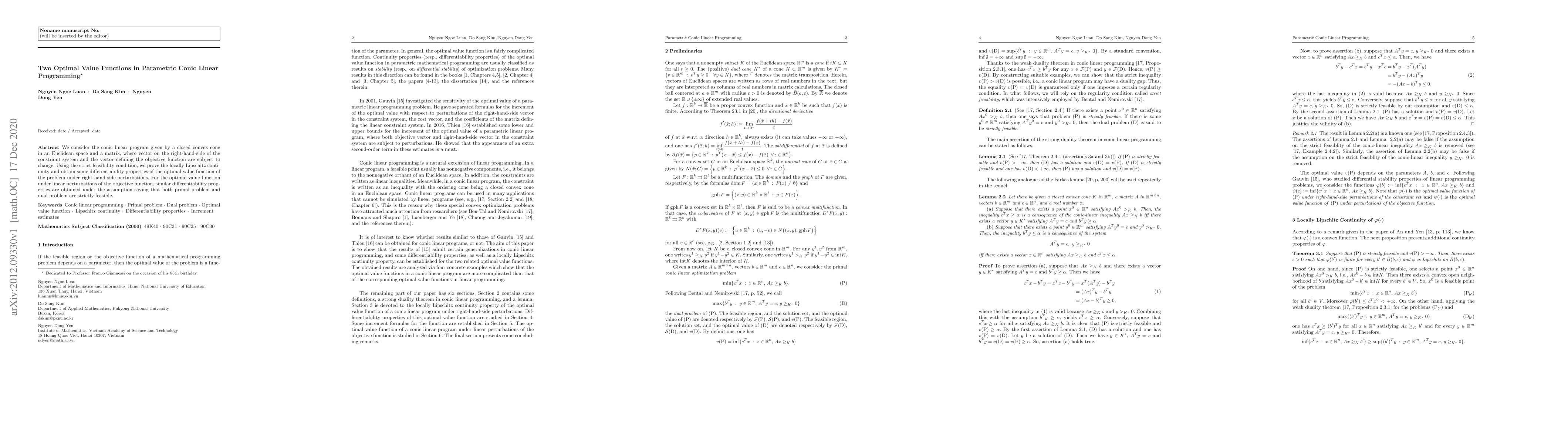 This paper investigates the continuity and differentiability of optimal value functions in conic linear programming under perturbations of right-hand side and objective function.