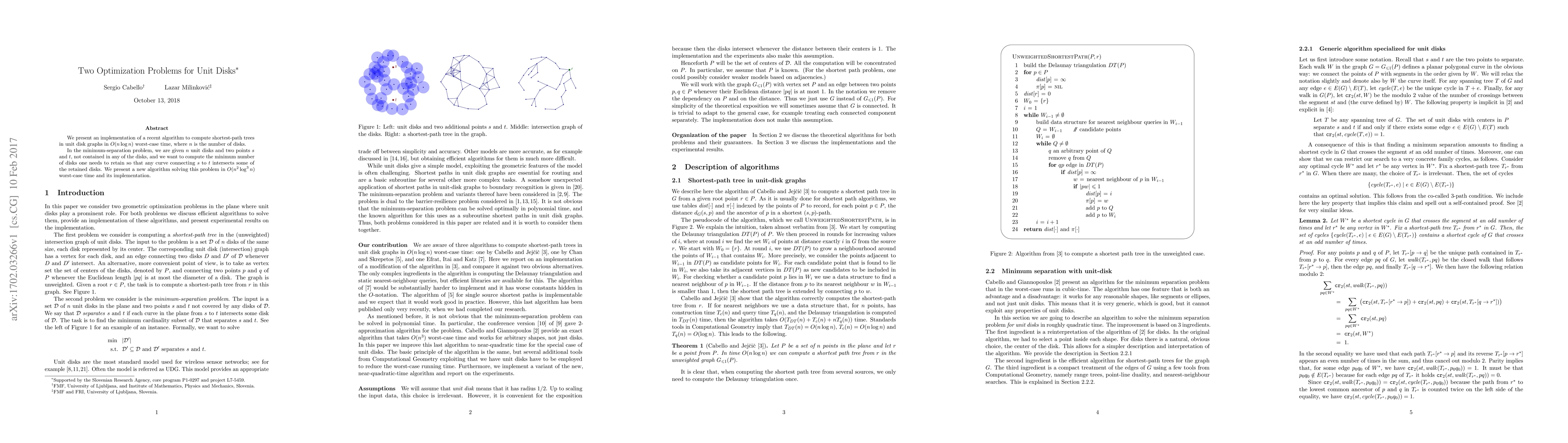 We present an implementation of a recent algorithm to compute shortest-path trees in unit disk graphs in $O(n\log n)$ worst-case time, where $n$ is the number of disks. In the minimum-separation problem, we are given $n$ unit disks and two points $s$ and $t$, not contained in any of the disks, and we want to compute the minimum number of disks one needs to retain so that any curve connecting $s$ to $t$ intersects some of the retained disks. We present a new algorithm solving this problem in $O(n^2\log^3 n)$ worst-case time and its implementation.