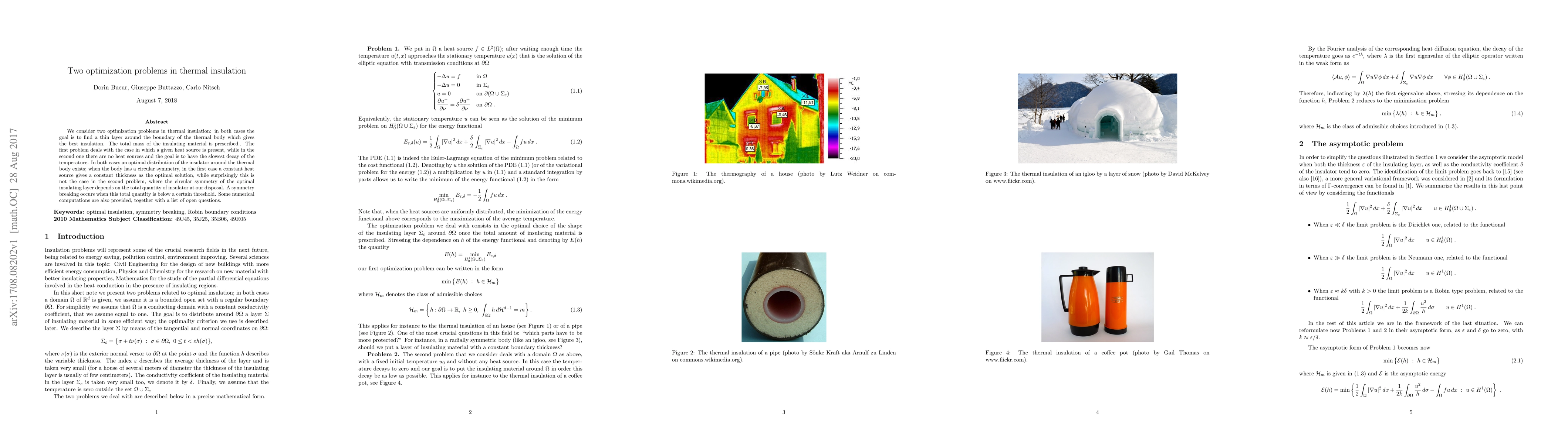 This paper addresses two optimization problems for thermal insulation, aiming to find the best thin layer distribution around a thermal body to maximize insulation under a fixed mass constraint. The first problem considers a constant heat source, while the second seeks the slowest temperature decay without heat sources. The optimal insulating layer's symmetry varies depending on the available insulator quantity, with symmetry breaking occurring below a certain threshold.