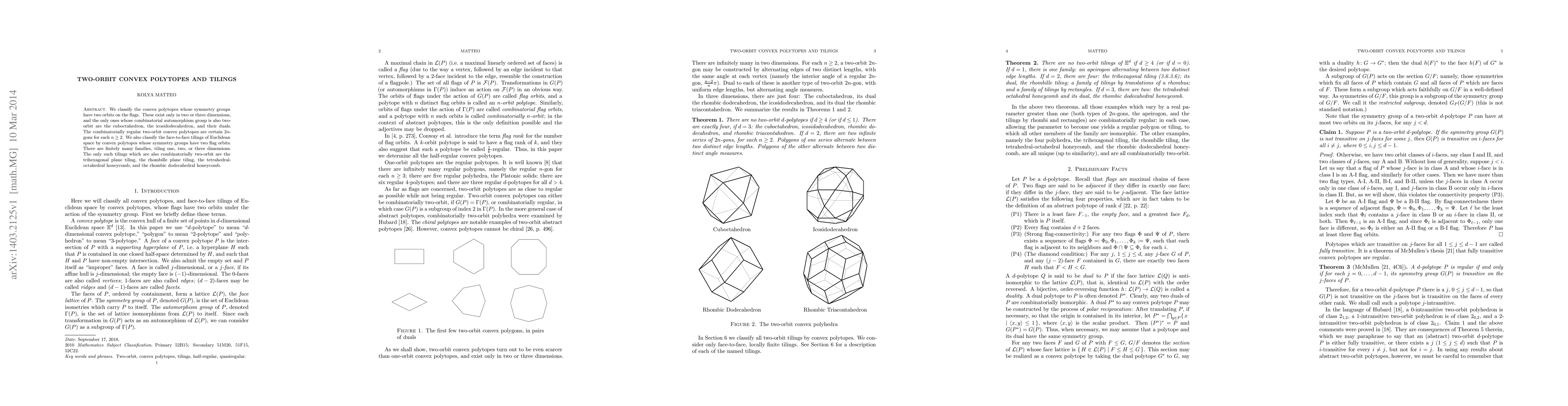 Two-orbit polytopes provide a novel area of study that combines geometric and combinatorial techniques