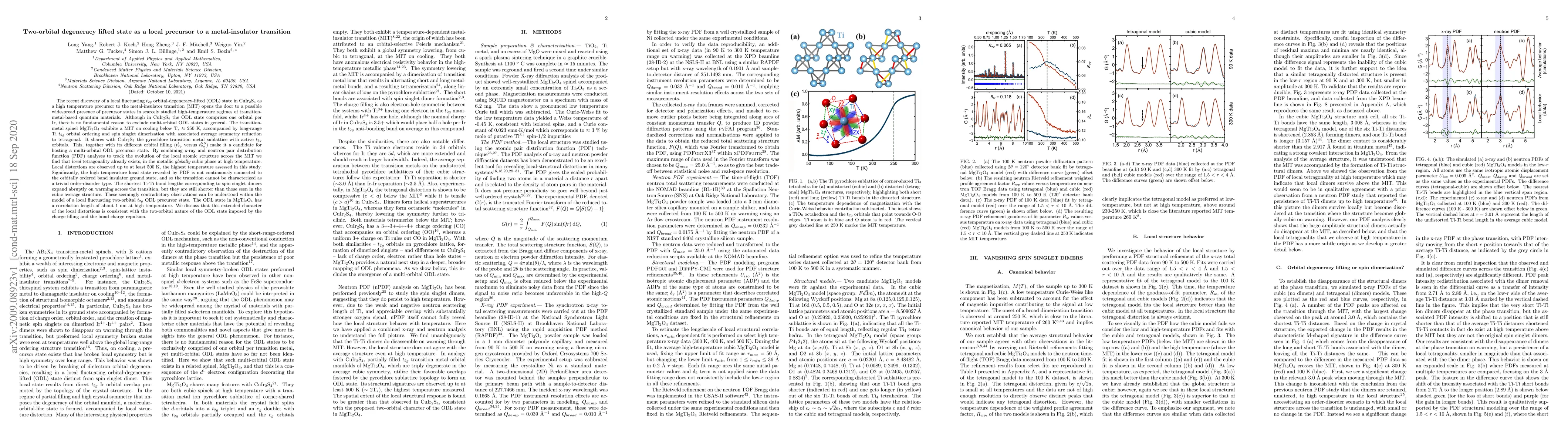 This research identifies a two-orbital t2g orbital-degeneracy-lifted (ODL) precursor state in MgTi2O4, a material exhibiting a metal-insulator transition (MIT). Utilizing x-ray and neutron pair distribution function analyses, the study reveals local tetragonality in the metallic phase, persisting up to 500 K. The transition, however, is not order-disorder but involves an abrupt change in Ti-Ti spin singlet dimer bonds, supporting the existence of a fluctuating, extended ODL state with a correlation length of ~1 nm at high temperatures.