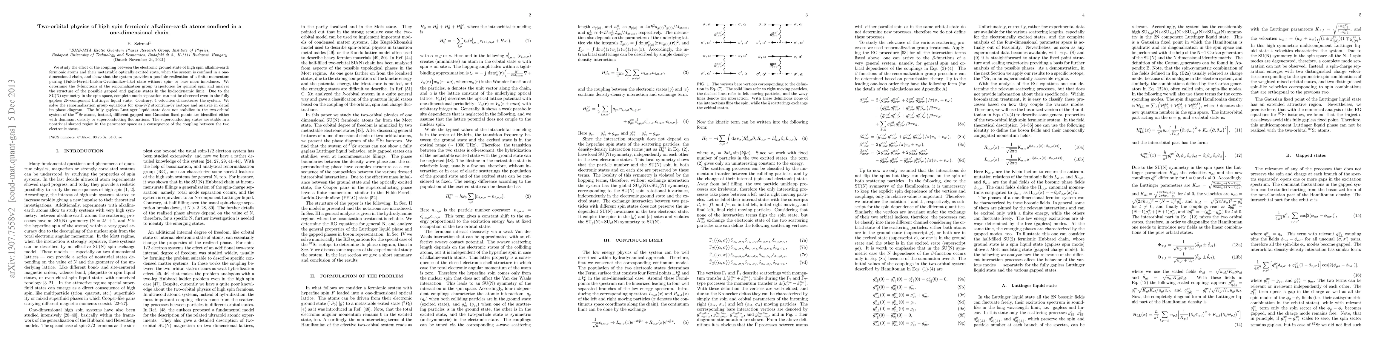 We study the effect of the coupling between the electronic ground state of high spin alkaline-earth fermionic atoms and their metastable optically excited state, when the system is confined in a one-dimensional chain, and show that the system provides a possible realization of a finite momentum pairing (Fulde-Ferrell-Larkin-Ovchinnikov-like) state without spin- or bare mass imbalance. We determine the $\beta$-functions of the renormalization group trajectories for general spin and analyze the structure of the possible gapped and gapless states in the hydrodynamic limit. Due to the SU(N) symmetry in the spin space, complete mode separation can not be observed even in the fully gapless 2N-component Luttinger liquid state. Contrary, 4 velocities characterize the system. We solve the renormalization group equations for spin-9/2 strontium-87 isotope and analyze in detail its phase diagram. The fully gapless Luttinger liquid state does not stabilize in the two-orbital system of the $^{87}$Sr atoms, instead, different gapped non-Gaussian fixed points are identified either with dominant density or superconducting fluctuations. The superconducting states are stable in a nontrivial shaped region in the parameter space as a consequence of the coupling between the two electronic states.
