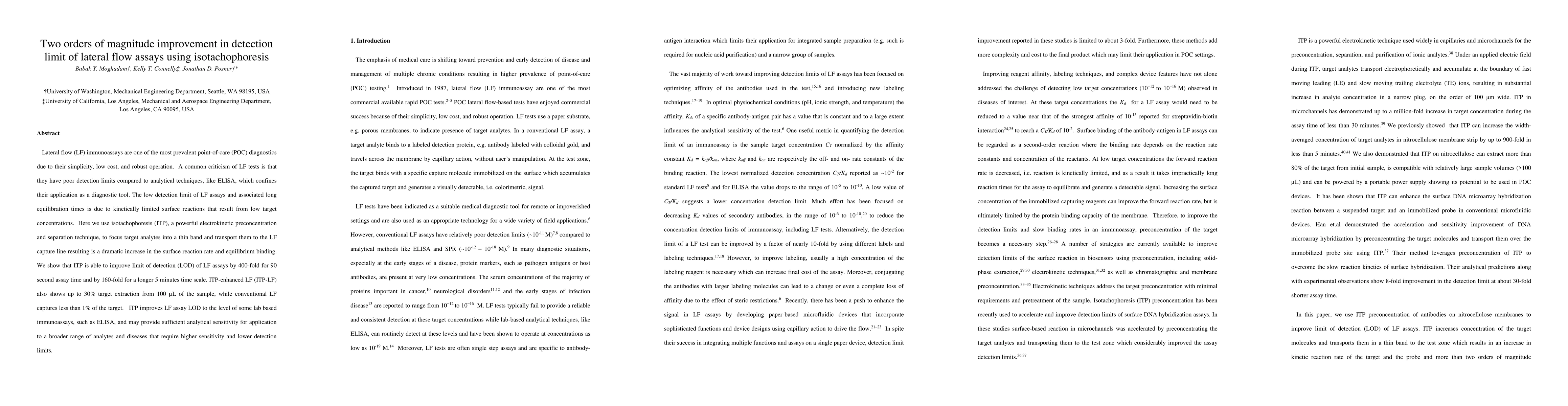 Lateral flow (LF) immunoassays are one of the most prevalent point-of-care (POC) diagnostics due to their simplicity, low cost, and robust operation. A common criticism of LF tests is that they have poor detection limits compared to analytical techniques, like ELISA, which confines their application as a diagnostic tool. The low detection limit of LF assays and associated long equilibration times is due to kinetically limited surface reactions that result from low target concentrations. Here we use isotachophoresis (ITP), a powerful electrokinetic preconcentration and separation technique, to focus target analytes into a thin band and transport them to the LF capture line resulting is a dramatic increase in the surface reaction rate and equilibrium binding. We show that ITP is able to improve limit of detection (LOD) of LF assays by 400-fold for 90 second assay time and by 160-fold for a longer 5 minutes time scale. ITP-enhanced LF (ITP-LF) also shows up to 30% target extraction from 100 uL of the sample, while conventional LF captures less than 1% of the target. ITP improves LF assay LOD to the level of some lab based immunoassays, such as ELISA, and may provide sufficient analytical sensitivity for application to a broader range of analytes and diseases that require higher sensitivity and lower detection limits.