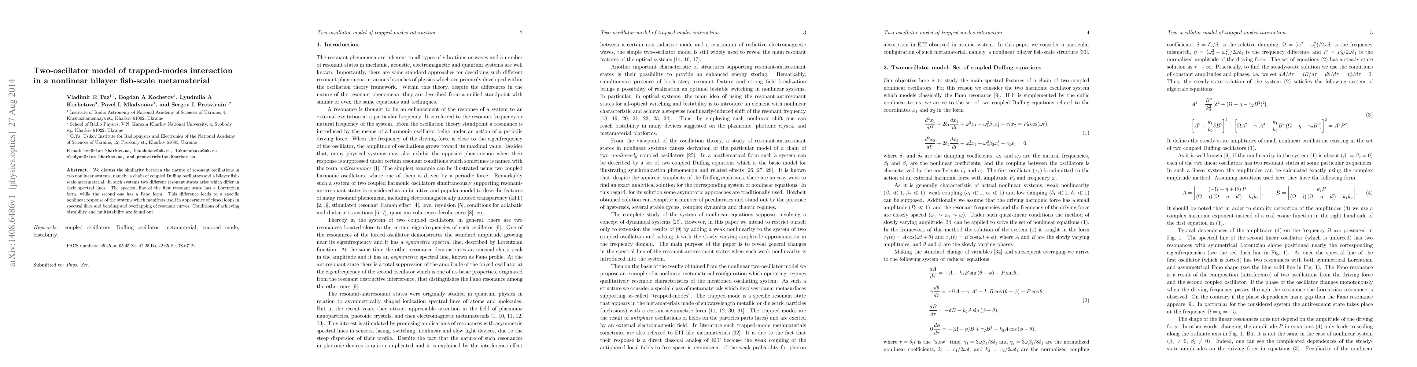 We discuss the similarity between the nature of resonant oscillations in two nonlinear systems, namely, a chain of coupled Duffing oscillators and a bilayer fish-scale metamaterial. In such systems two different resonant states arise which differ in their spectral lines. The spectral line of the first resonant state has a Lorentzian form, while the second one has a Fano form. This difference leads to a specific nonlinear response of the systems which manifests itself in appearance of closed loops in spectral lines and bending and overlapping of resonant curves. Conditions of achieving bistability and multistability are found out.