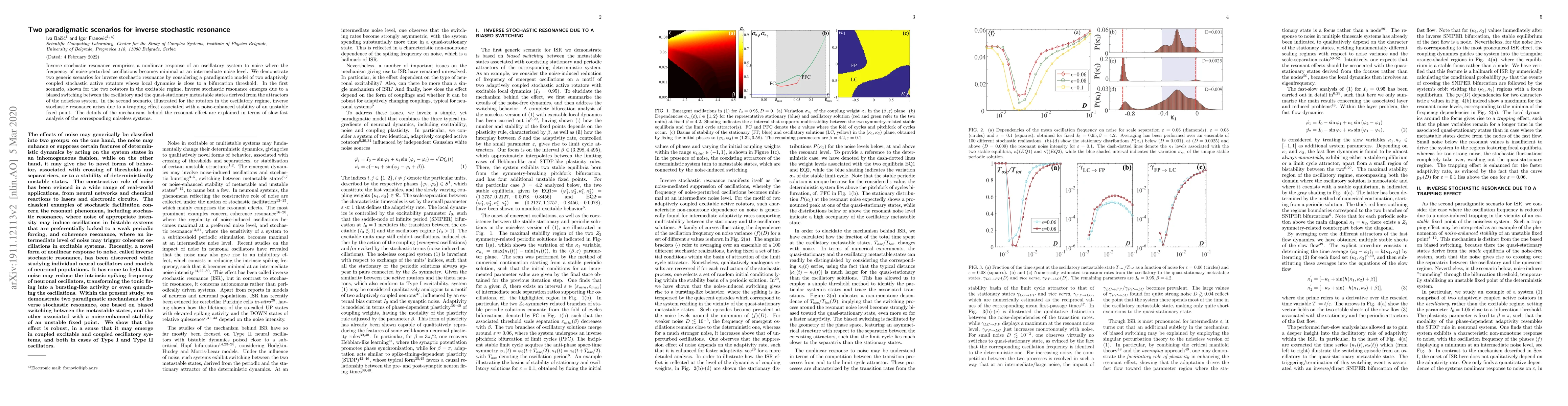 Inverse stochastic resonance comprises a nonlinear response of an oscillatory system to noise where the frequency of noise-perturbed oscillations becomes minimal at an intermediate noise level. We demonstrate two generic scenarios for inverse stochastic resonance by considering a paradigmatic model of two adaptively coupled stochastic active rotators whose local dynamics is close to a bifurcation threshold. In the first scenario, shown for the two rotators in the excitable regime, inverse stochastic resonance emerges due to a biased switching between the oscillatory and the quasi-stationary metastable states derived from the attractors of the noiseless system. In the second scenario, illustrated for the rotators in the oscillatory regime, inverse stochastic resonance arises due to a trapping effect associated with a noise-enhanced stability of an unstable fixed point. The details of the mechanisms behind the resonant effect are explained in terms of slow-fast analysis of the corresponding noiseless systems.
