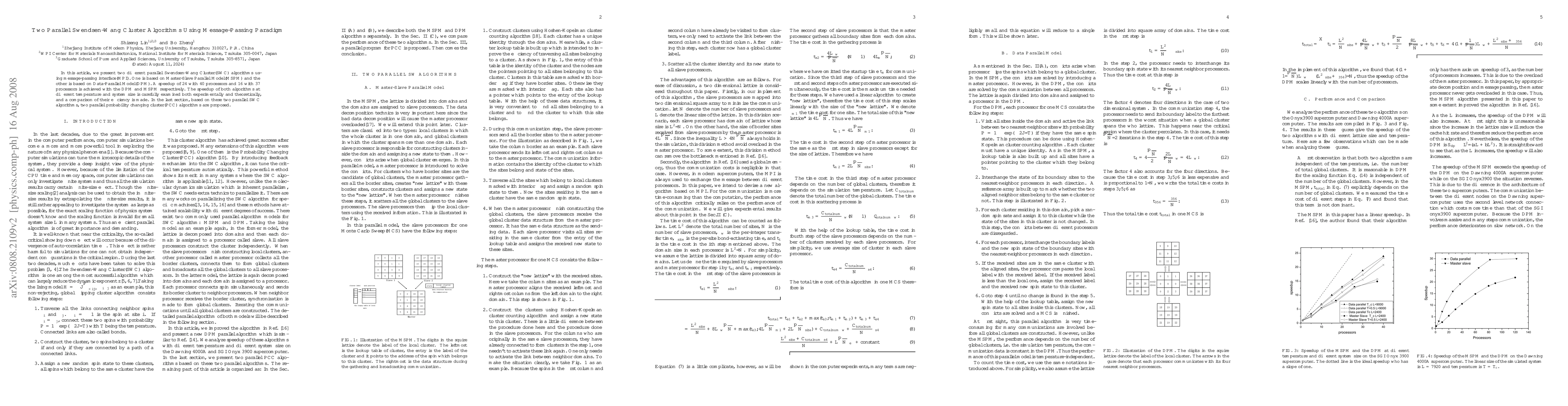 This paper introduces two parallel implementations of the Swendsen-Wang Cluster algorithm using MPI: one based on Master-Slave Parallel Model and the other on Data-Parallel Model. Both algorithms achieve significant speedups, with the DPM reaching 24x on 40 processors and the MSPM achieving 16x on 37 processors.