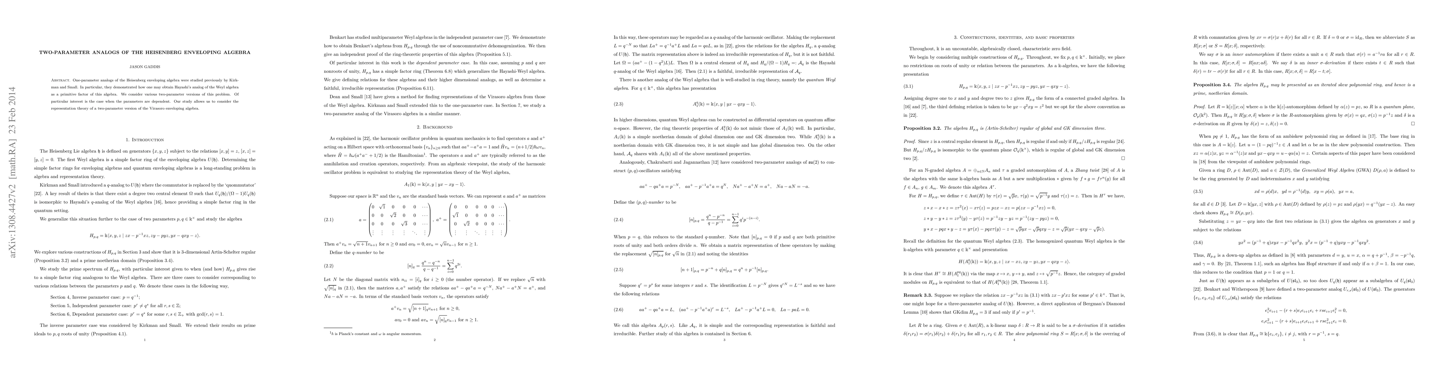 One-parameter analogs of the Heisenberg enveloping algebra were studied previously by Kirkman and Small. In particular, they demonstrated how one may obtain Hayashi's analog of the Weyl algebra as a primitive factor of this algebra. We consider various two-parameter versions of this problem. Of particular interest is the case when the parameters are dependent. Our study allows us to consider the representation theory of a two-parameter version of the Virasoro enveloping algebra.