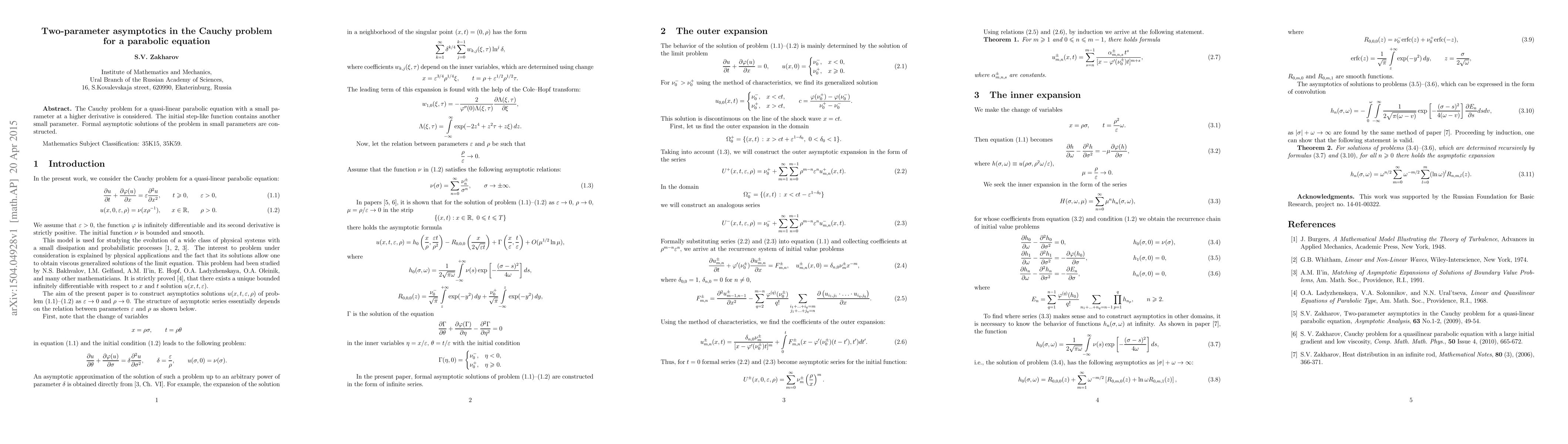 This research paper explores the Cauchy problem for a quasi-linear parabolic equation, focusing on small parameters at higher derivatives and in the initial step-like function. It constructs formal asymptotic solutions in these small parameters.