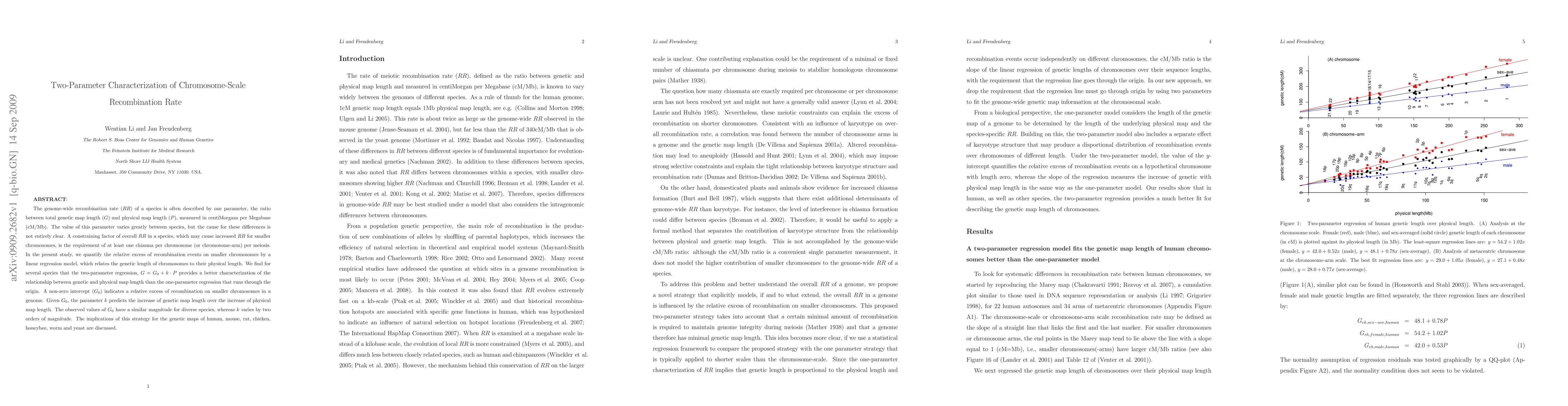 This paper proposes a two-parameter characterization of genome-wide recombination rate, finding that a non-zero intercept ($G_0$) indicates an excess of recombination on smaller chromosomes. The study uses a linear regression model to better describe the relationship between genetic and physical map lengths across various species, suggesting that $G_0$ is consistent while the slope parameter $k$ varies significantly.