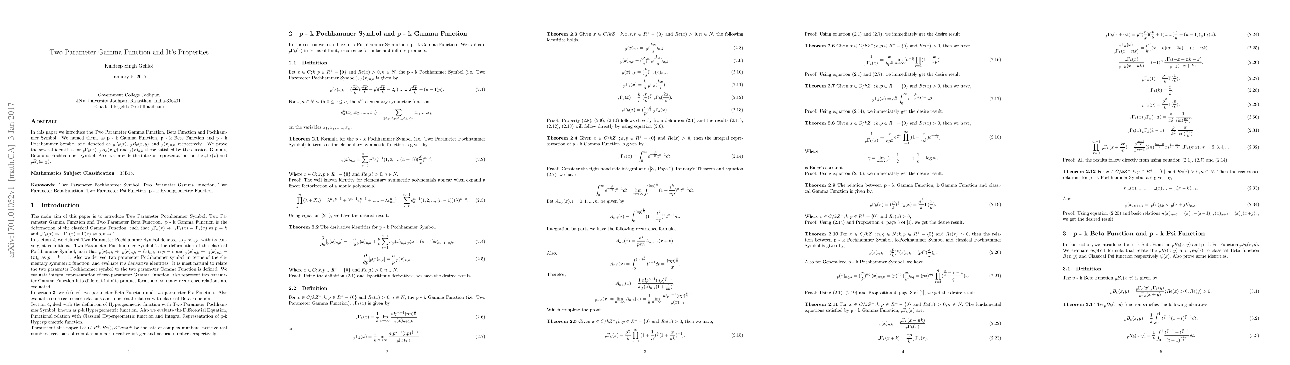 This paper introduces the Two Parameter Gamma Function, Beta Function, and Pochhammer Symbol, denoted as $_{p}\Gamma_{k}(x)$, $_{p}B_{k}(x,y)$, and $_{p}(x)_{n,k}$, respectively. It proves several identities and provides integral representations for these functions, paralleling properties of their classical counterparts.