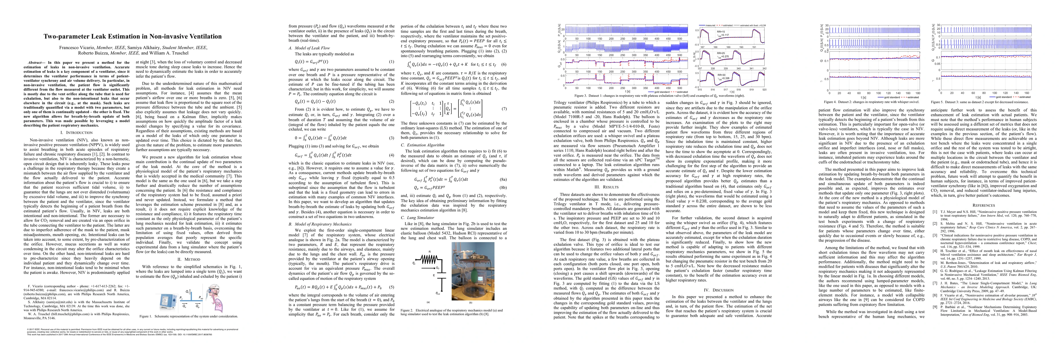 In this paper we present a method for the estimation of leaks in non-invasive ventilation. Accurate estimation of leaks is a key component of a ventilator, since it determines the ventilator performance in terms of patient-ventilator synchrony and air volume delivery. In particular, in non-invasive ventilation, the patient flow is significantly different from the flow measured at the ventilator outlet. This is mostly due to the vent orifice along the tube that is used for exhalation, but also to the non-intentional leaks that occur elsewhere in the circuit (e.g., at the mask). Such leaks are traditionally quantified via a model with two parameters, but only one of them is continually updated - the other is fixed. The new algorithm allows for breath-by-breath update of both parameters. This was made possible by leveraging a model describing the patient respiratory mechanics.