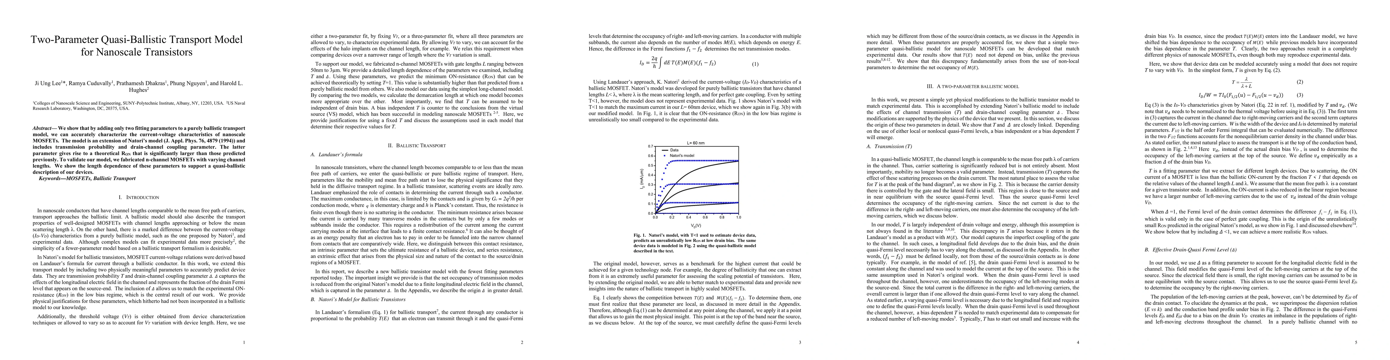 We show that by adding only two fitting parameters to a purely ballistic transport model, we can accurately characterize the current-voltage characteristics of nanoscale MOSFETs. The model is an extension to a ballistic model (J. Appl. Phys. 76, 4879 (1994)) and includes transmission probability and the drain-channel coupling capacitor. The latter parameter gives rise to a theoretical RON that is significantly larger than those predicted previously. To validate our model, we fabricated n-channel MOSFETs with varying channel lengths. We show the length dependence of these parameters to support a quasi-ballistic description of our devices.