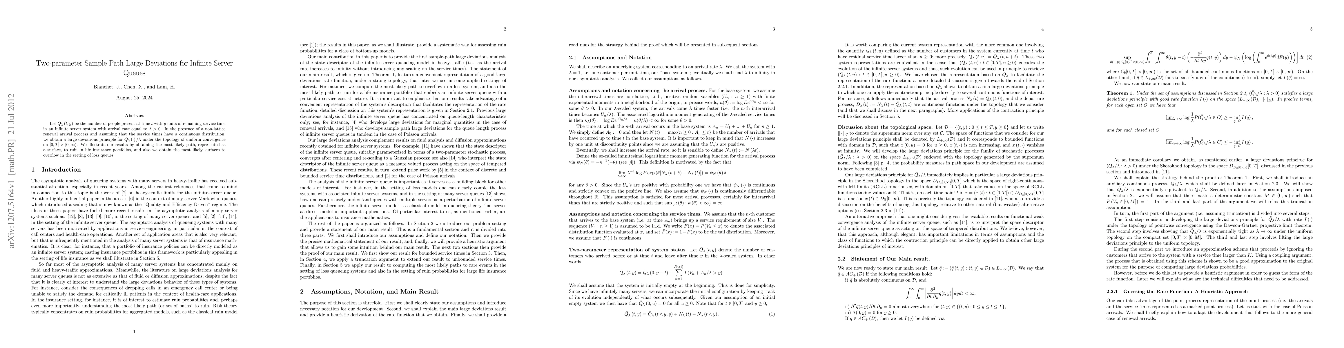 This paper establishes a large deviations principle for the number of people in an infinite server queue with non-lattice renewal arrivals and continuous service times, focusing on the sample path behavior. It applies the results to life insurance portfolios and loss queues to identify the most probable paths to ruin and overflow.