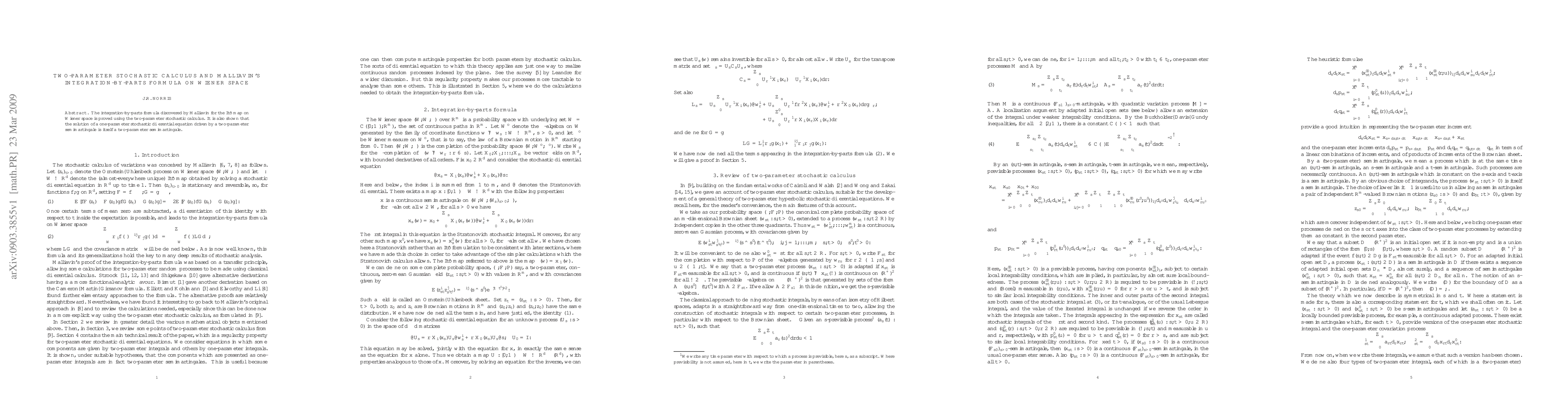 Summary: This paper proves Malliavin's integration-by-parts formula on Wiener space using two-parameter stochastic calculus. It also demonstrates that solutions to one-parameter stochastic differential equations driven by two-parameter semimartingales are themselves two-parameter semimartingales.