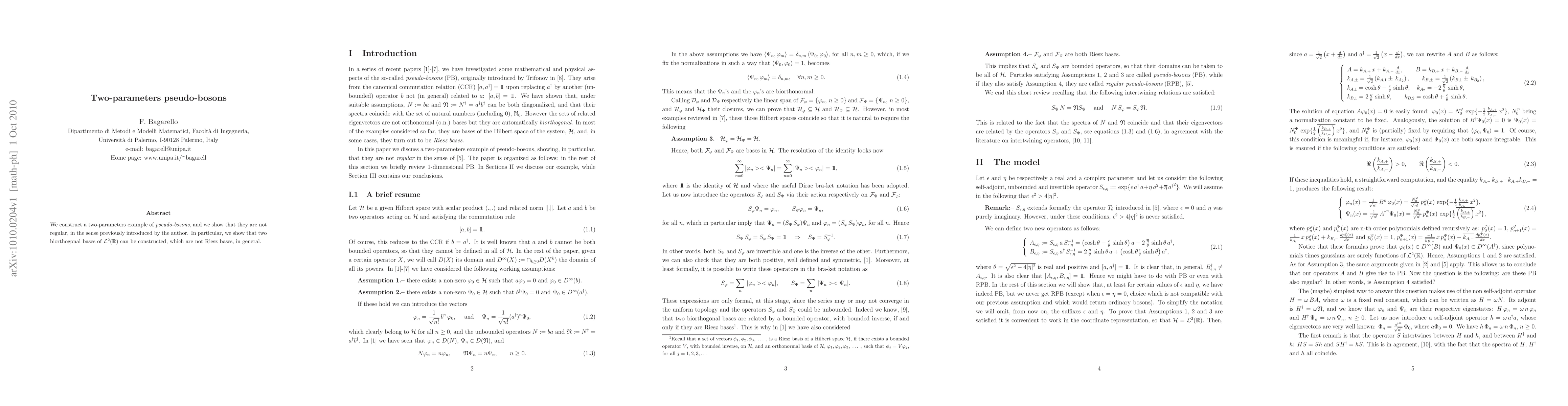We construct a two-parameters example of {\em pseudo-bosons}, and we show that they are not regular, in the sense previously introduced by the author. In particular, we show that two biorthogonal bases of $\Lc^2(\Bbb R)$ can be constructed, which are not Riesz bases, in general.