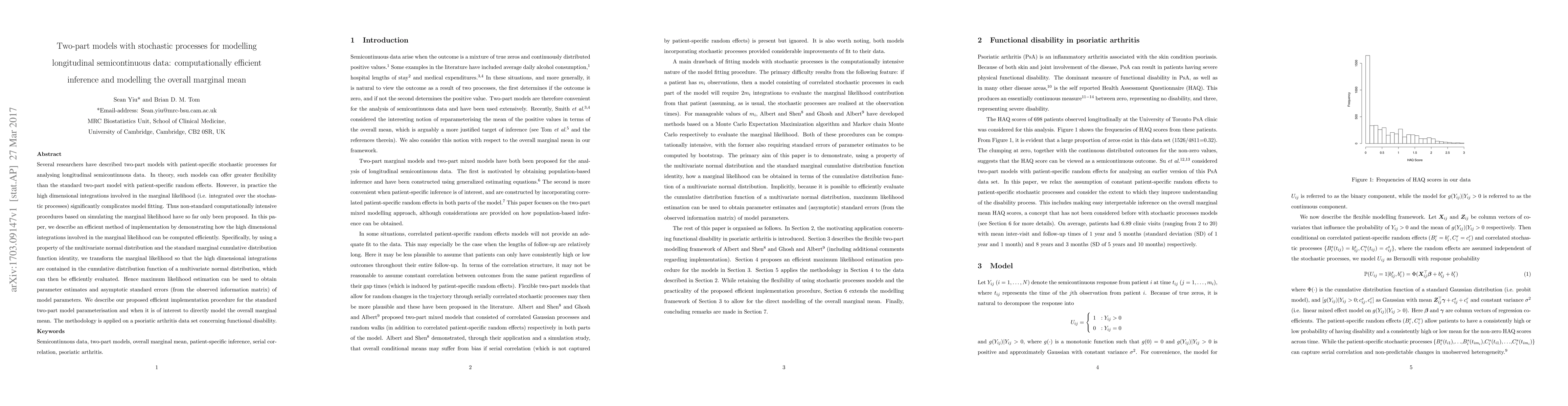 Researchers develop an efficient method to fit two-part models with stochastic processes for analyzing longitudinal semicontinuous data, allowing for flexible modeling and estimation.