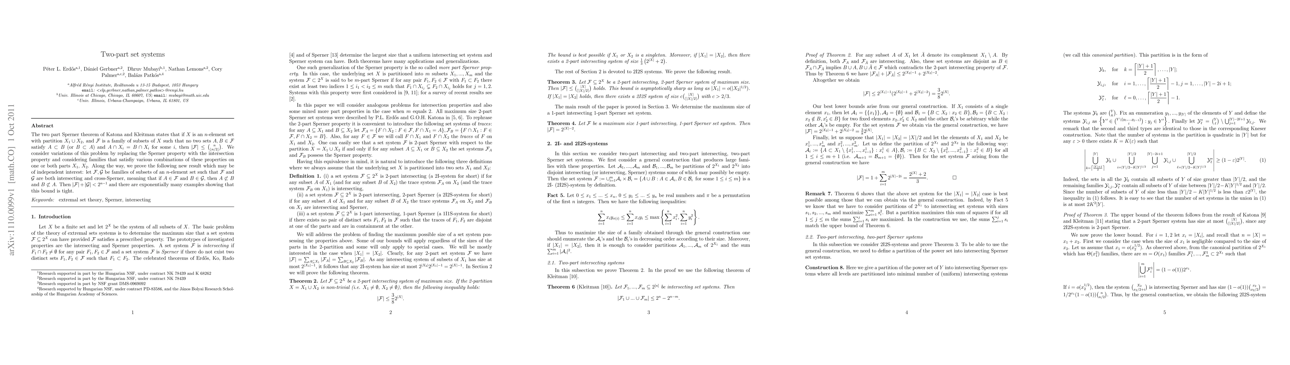 The two part Sperner theorem of Katona and Kleitman states that if $X$ is an $n$-element set with partition $X_1 \cup X_2$, and $\cF$ is a family of subsets of $X$ such that no two sets $A, B \in \cF$ satisfy $A \subset B$ (or $B \subset A$) and $A \cap X_i=B \cap X_i$ for some $i$, then $|\cF| \le {n \choose \lfloor n/2 \rfloor}$. We consider variations of this problem by replacing the Sperner property with the intersection property and considering families that satisfiy various combinations of these properties on one or both parts $X_1$, $X_2$. Along the way, we prove the following new result which may be of independent interest: let $\cF, \cG$ be families of subsets of an $n$-element set such that $\cF$ and $\cG$ are both intersecting and cross-Sperner, meaning that if $A \in \cF$ and $B \in \cG$, then $A \not\subset B$ and $B \not\subset A$. Then $|\cF| +|\cG| < 2^{n-1}$ and there are exponentially many examples showing that this bound is tight.