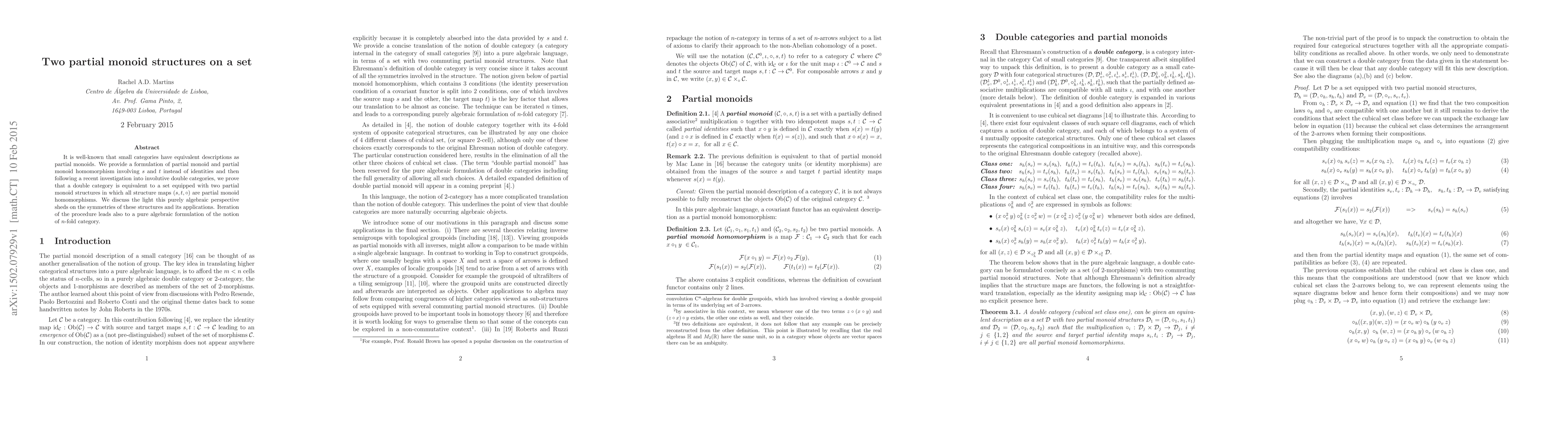 It is well-known that small categories have equivalent descriptions as partial monoids. We provide a formulation of partial monoid and partial monoid homomorphism involving $s$ and $t$ instead of identities and then following a recent investigation into involutive double categories, we prove that a double category is equivalent to a set equipped with two partial monoid structures in which all structure maps $(s,t,\circ)$ are partial monoid homomorphisms. We discuss the light this purely algebraic perspective sheds on the symmetries of these structures and its applications. Iteration of the procedure leads also to a pure algebraic formulation of the notion of $n$-fold category.