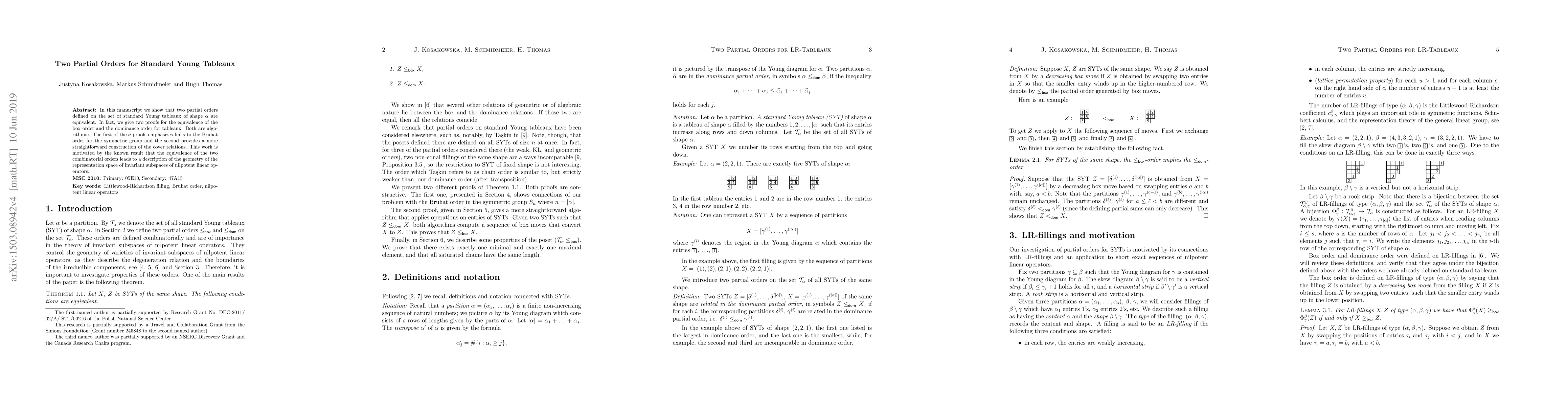 This paper demonstrates the equivalence of two partial orders on standard Young tableaux: the box order and the dominance order. It presents two algorithmic proofs, linking the first to the Bruhat order and the second to a more direct construction of cover relations.