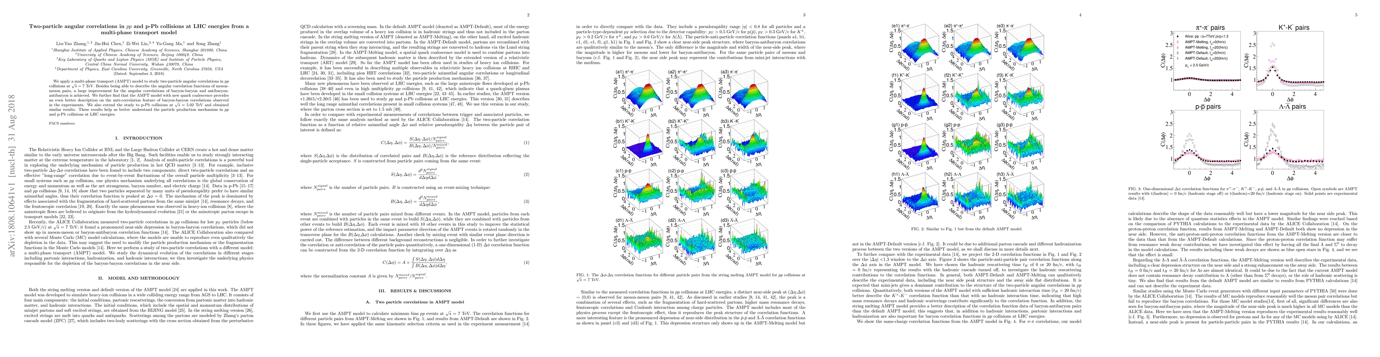 We apply a multi-phase transport (AMPT) model to study two-particle angular correlations in $pp$ collisions at $\sqrt{s}= 7$ TeV. Besides being able to describe the angular correlation functions of meson-meson pairs, a large improvement for the angular correlations of baryon-baryon and antibaryon-antibaryon is achieved. We further find that the AMPT model with new quark coalescence provides an even better description on the anti-correlation feature of baryon-baryon correlations observed in the experiments. We also extend the study to p-Pb collisions at $\sqrt{s}= 5.02$ TeV and obtained similar results. These results help us better understand the particle production mechanism in $pp$ and p-Pb collisions at LHC energies.