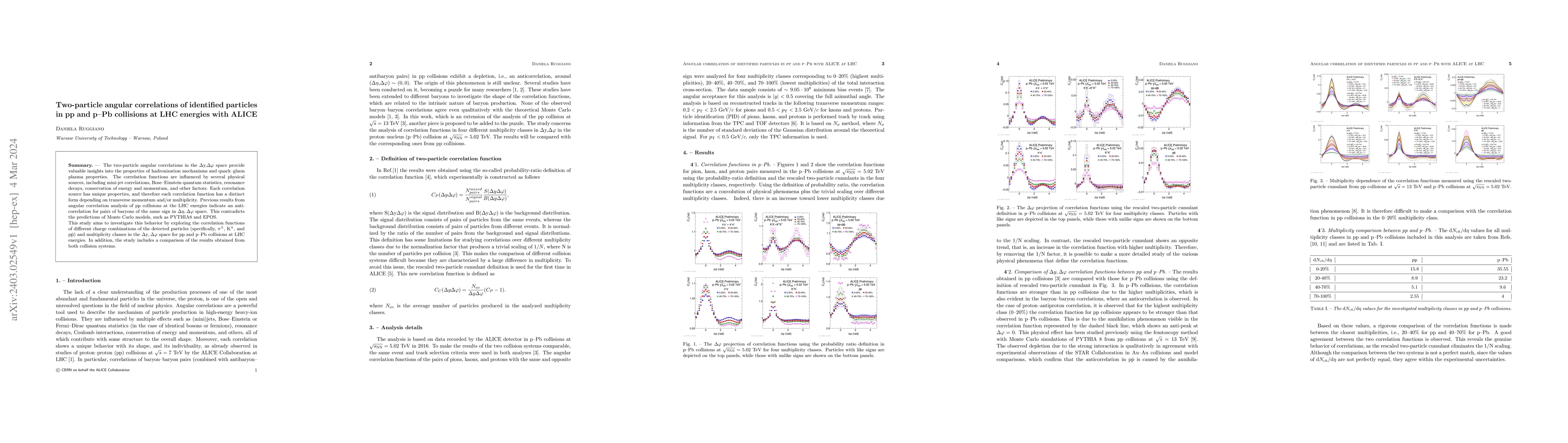 The two-particle angular correlations in the $\Delta$y,$\Delta\varphi$ space provide valuable insights into the properties of hadronization mechanisms and quark-gluon plasma properties. The correlation functions are influenced by several physical sources, including mini-jet correlations, Bose-Einstein quantum statistics, resonance decays, conservation of energy and momentum, and other factors. Each correlation source has unique properties, and therefore each correlation function has a distinct form depending on transverse momentum and/or multiplicity. Previous results from angular correlation analysis of pp collisions at the LHC energies indicate an anticorrelation for pairs of baryons of the same sign in $\Delta\eta,\Delta\varphi$ space. This contradicts the predictions of Monte Carlo models, such as PYTHIA8 and EPOS. This study aims to investigate this behavior by exploring the correlation functions of different charge combinations of the detected particles (specifically, $\rm{\pi^{\pm}}$, $\rm{K^{\pm}}$, and $\rm{p}$$\bar{\rm{p}}$) and multiplicity classes in the $\Delta$y$,\Delta\varphi$ space for pp and p--Pb collisions at LHC energies. In addition, the study includes a comparison of the results obtained from both collision systems.