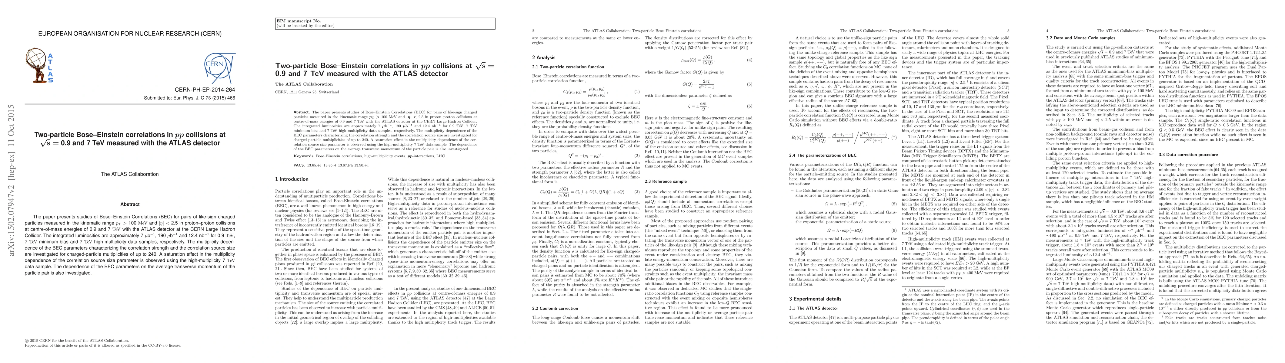 This paper investigates Bose-Einstein Correlations in proton-proton collisions at 0.9 and 7 TeV with the ATLAS detector, finding a saturation effect in the correlation source size at high multiplicities and analyzing the dependence of correlation parameters on the average transverse momentum of particle pairs.