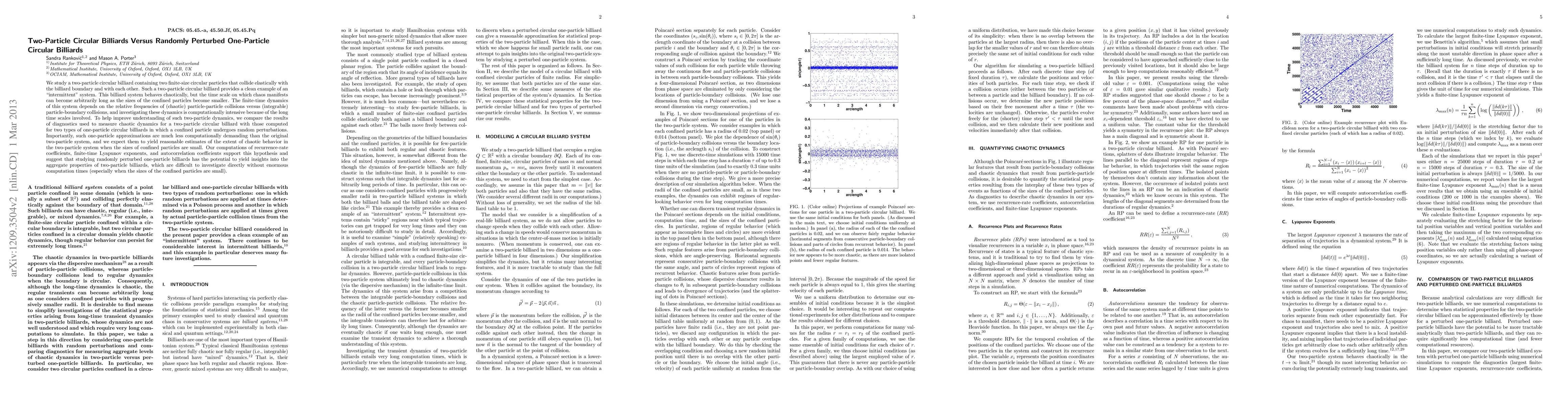 We study a two-particle circular billiard containing two finite-size circular particles that collide elastically with the billiard boundary and with each other. Such a two-particle circular billiard provides a clean example of an "intermittent" system. This billiard system behaves chaotically, but the time scale on which chaos manifests can become arbitrarily long as the sizes of the confined particles become smaller. The finite-time dynamics of this system depends on the relative frequencies of (chaotic) particle-particle collisions versus (integrable) particle-boundary collisions, and investigating these dynamics is computationally intensive because of the long time scales involved. To help improve understanding of such two-particle dynamics, we compare the results of diagnostics used to measure chaotic dynamics for a two-particle circular billiard with those computed for two types of one-particle circular billiards in which a confined particle undergoes random perturbations. Importantly, such one-particle approximations are much less computationally demanding than the original two-particle system, and we expect them to yield reasonable estimates of the extent of chaotic behavior in the two-particle system when the sizes of confined particles are small. Our computations of recurrence-rate coefficients, finite-time Lyapunov exponents, and autocorrelation coefficients support this hypothesis and suggest that studying randomly perturbed one-particle billiards has the potential to yield insights into the aggregate properties of two-particle billiards, which are difficult to investigate directly without enormous computation times (especially when the sizes of the confined particles are small).
