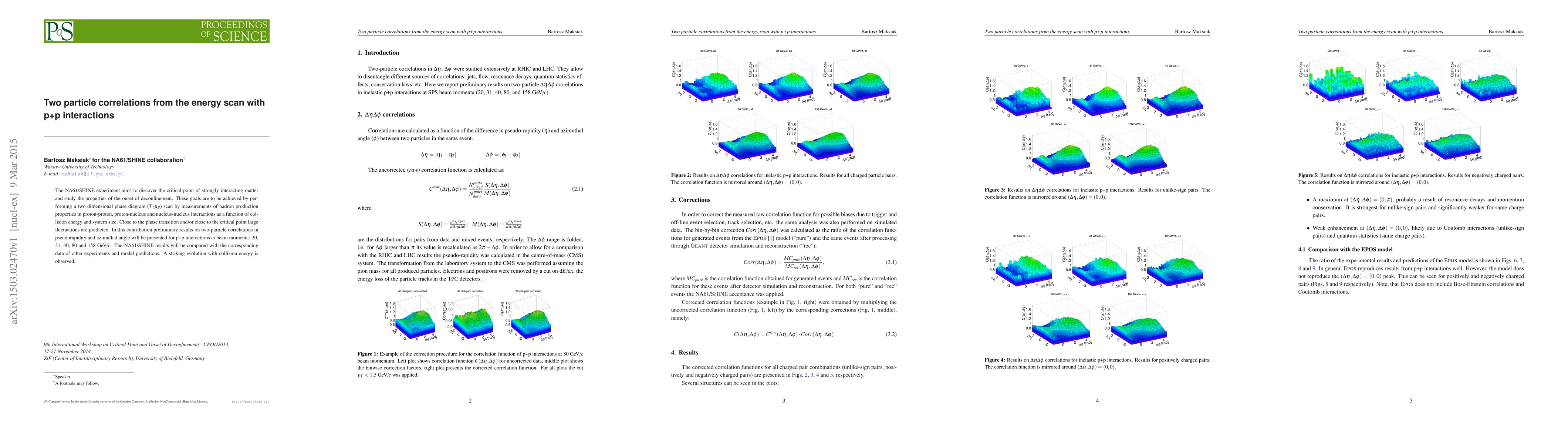 The NA61/Shine experiment aims to discover the critical point of strongly interacting matter and study the properties of the onset of deconfinement. These goals are to be achieved by performing a two dimensional phase diagram T-mu_B scan by measurements of hadron production properties in proton-proton, proton-nucleus and nucleus-nucleus interactions as a function of collision energy and system size. Close to the phase transition and/or close to the critical point large fluctuations are predicted. In this contribution preliminary results on two-particle correlations in pseudorapidity and azimuthal angle will be presented for p+p interactions at beam momenta: 20, 31, 40, 80 and 158 GeV/c. The NA61/Shine results will be compared with the corresponding data of other experiments and model predictions. A striking evolution with collision energy is observed.