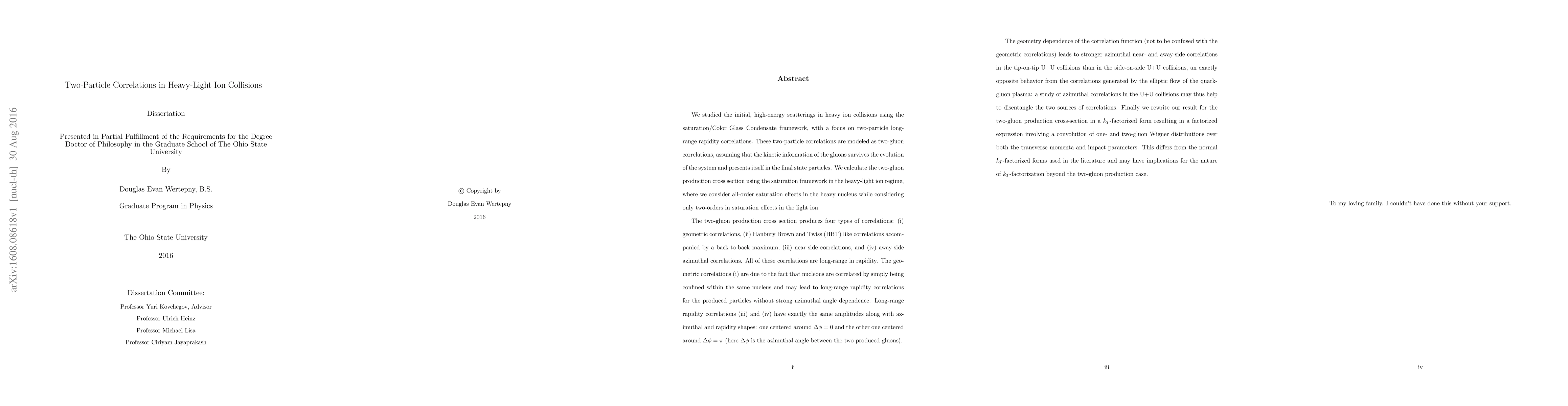 We study the initial, high-energy scatterings in heavy ion collisions using the saturation/Color Glass Condensate framework. We focus on two-particle long-range rapidity correlations which are modeled as two-gluon correlations. We calculate the two-gluon production cross section using the saturation framework in the heavy-light ion regime, including all-order saturation effects in the heavy nucleus while considering only two-orders in the light ion. The two-gluon production cross section generates four types of long-range in rapidity correlations: (i) geometric correlations, (ii) Hanbury Brown and Twiss (HBT) like correlations accompanied by a back-to-back maximum, (iii) near-side correlations, and (iv) away-side azimuthal correlations. The geometric correlations (i) are due to the fact that nucleons are correlated by simply being confined within the same nucleus. Correlations (iii) and (iv) have exactly the same amplitudes along with azimuthal and rapidity shapes: one centered around $\Delta \phi =0$ and the other one centered around $\Delta \phi =\pi$ (here $\Delta \phi$ is the azimuthal angle between the two produced gluons). The geometry dependence of the correlation function leads to stronger azimuthal near- and away-side correlations in the tip-on-tip U+U collisions than in the side-on-side U+U collisions, an exactly opposite behavior from the correlations generated by the elliptic flow of the quark-gluon plasma: a study of azimuthal correlations in the U+U collisions may help to disentangle the two sources of correlations. Finally we rewrite our result for the two-gluon production cross-section in a $k_T$-factorized form resulting in an expression involving a convolution of one- and two-gluon Wigner distributions over the transverse momenta and impact parameters. This differs from the $k_T$-factorized forms used in the literature.