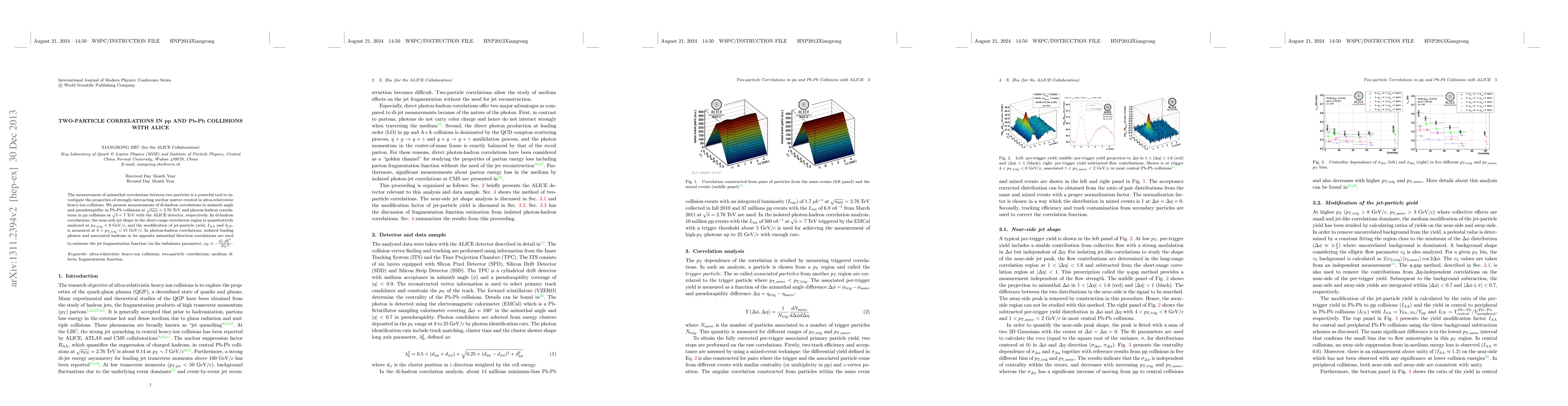 This paper investigates azimuthal correlations between particles in Pb-Pb collisions to study the properties of nuclear matter, and in pp collisions to estimate the jet fragmentation function, using the ALICE detector. Key findings include the analysis of near-side jet shapes and modifications in particle yields in heavy-ion collisions, and the use of photon-hadron correlations to measure fragmentation functions.