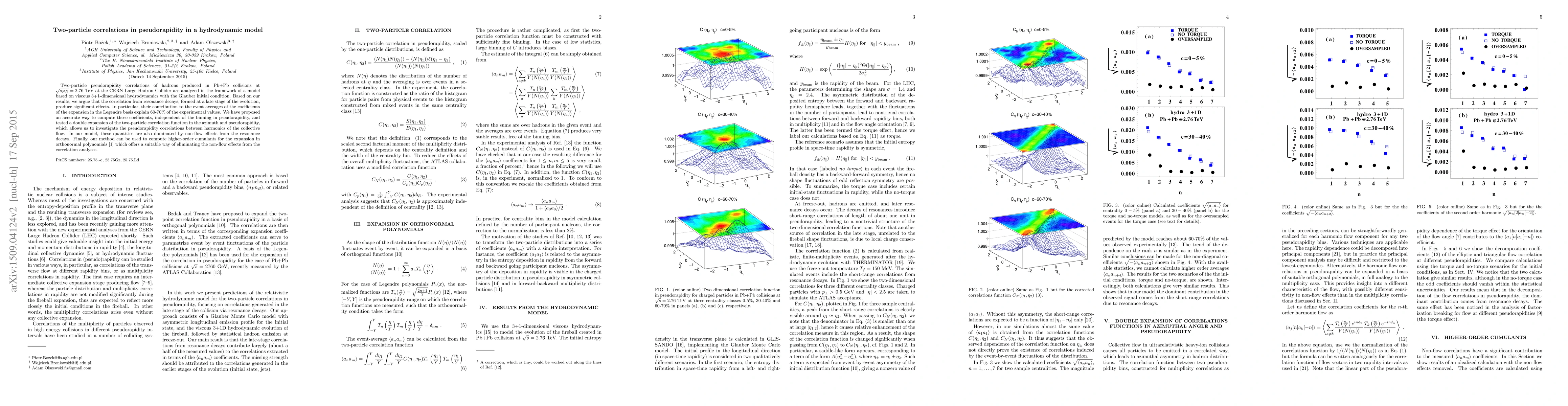 This paper analyzes two-particle pseudorapidity correlations in Pb+Pb collisions using a viscous hydrodynamic model, finding that resonance decays significantly contribute to the observed correlations, explaining 60-70% of experimental values. The study proposes a method to compute these coefficients independently of pseudorapidity binning and suggests a double expansion technique to investigate correlations between harmonics of the collective flow.