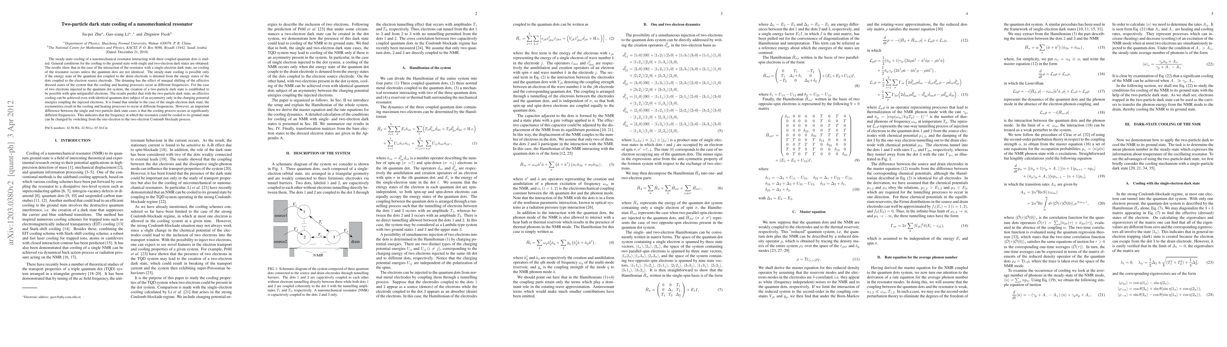 This paper explores the steady-state cooling of a nanomechanical resonator via interaction with quantum dots, revealing that cooling to the ground state is achievable through single and two-electron dark states under specific conditions. The two-particle dark state cooling is notably effective even when quantum dots are identical, provided there is an asymmetry in charging potential energies.