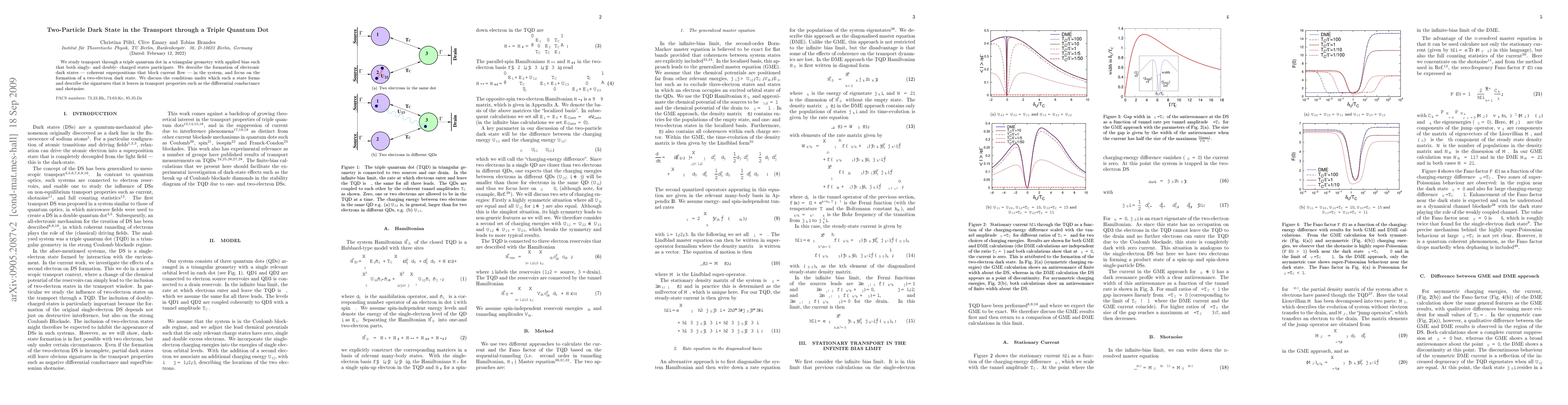 This paper investigates transport through a triangular triple quantum dot, focusing on the formation of electronic dark states that block current flow, particularly a two-electron dark state. It examines the conditions for this state's formation and its effects on differential conductance and shot noise.