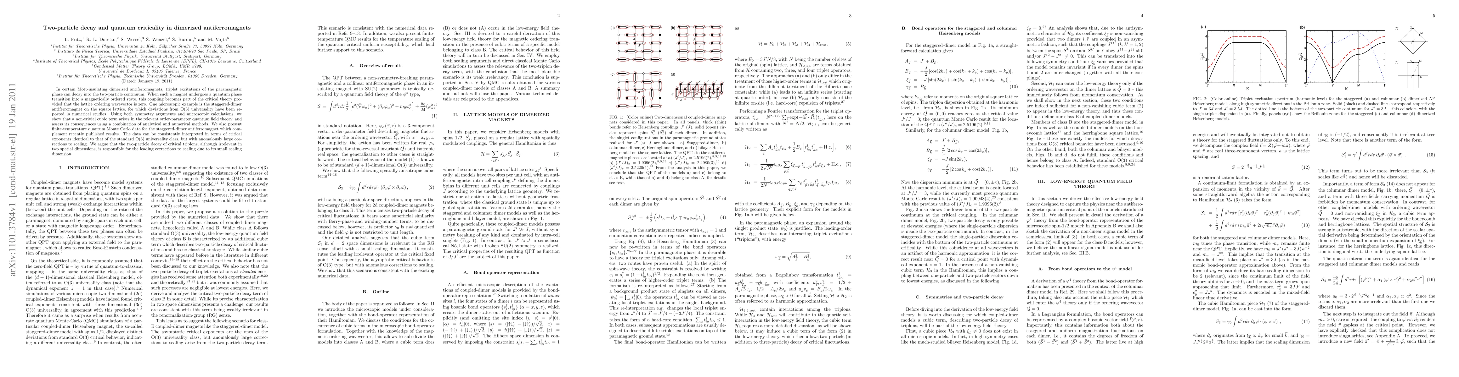 In certain Mott-insulating dimerized antiferromagnets, triplet excitations of the paramagnetic phase can decay into the two-particle continuum. When such a magnet undergoes a quantum phase transition into a magnetically ordered state, this coupling becomes part of the critical theory provided that the lattice ordering wavevector is zero. One microscopic example is the staggered-dimer antiferromagnet on the square lattice, for which deviations from O(3) universality have been reported in numerical studies. Using both symmetry arguments and microscopic calculations, we show that a non-trivial cubic term arises in the relevant order-parameter quantum field theory, and assess its consequences using a combination of analytical and numerical methods. We also present finite-temperature quantum Monte Carlo data for the staggered-dimer antiferromagnet which complement recently published results. The data can be consistently interpreted in terms of critical exponents identical to that of the standard O(3) universality class, but with anomalously large corrections to scaling. We argue that the two-particle decay of critical triplons, although irrelevant in two spatial dimensions, is responsible for the leading corrections to scaling due to its small scaling dimension.