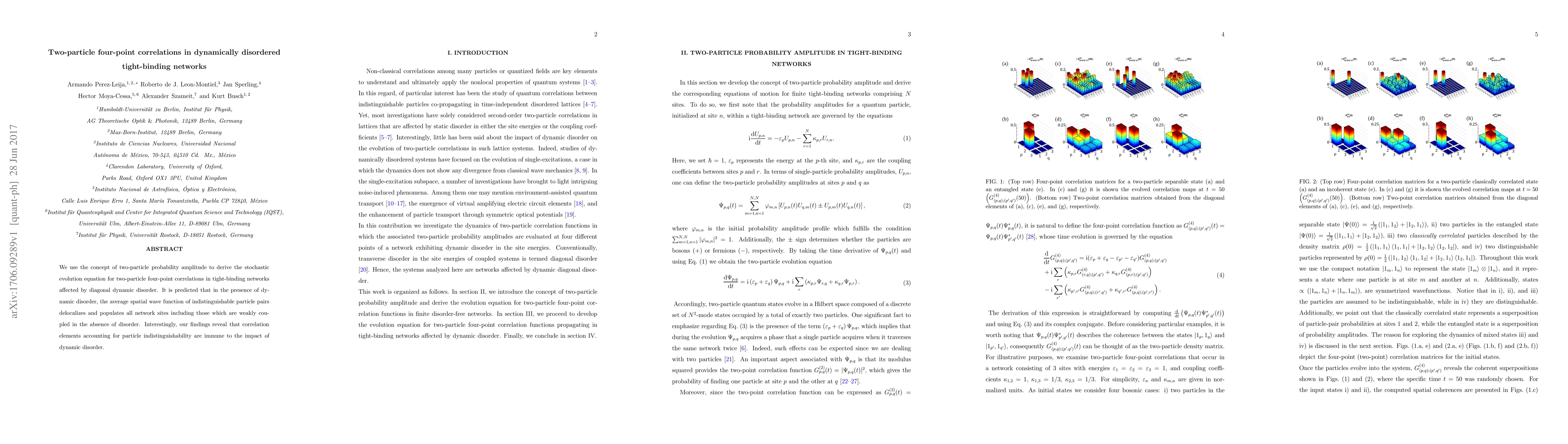 We use the concept of two-particle probability amplitude to derive the stochastic evolution equation for two-particle four-point correlations in tight-binding networks affected by diagonal dynamic disorder. It is predicted that in the presence of dynamic disorder, the average spatial wave function of indistinguishable particle pairs delocalizes and populates all network sites including those which are weakly coupled in the absence of disorder. Interestingly, our findings reveal that correlation elements accounting for particle indistinguishability are immune to the impact of dynamic disorder.