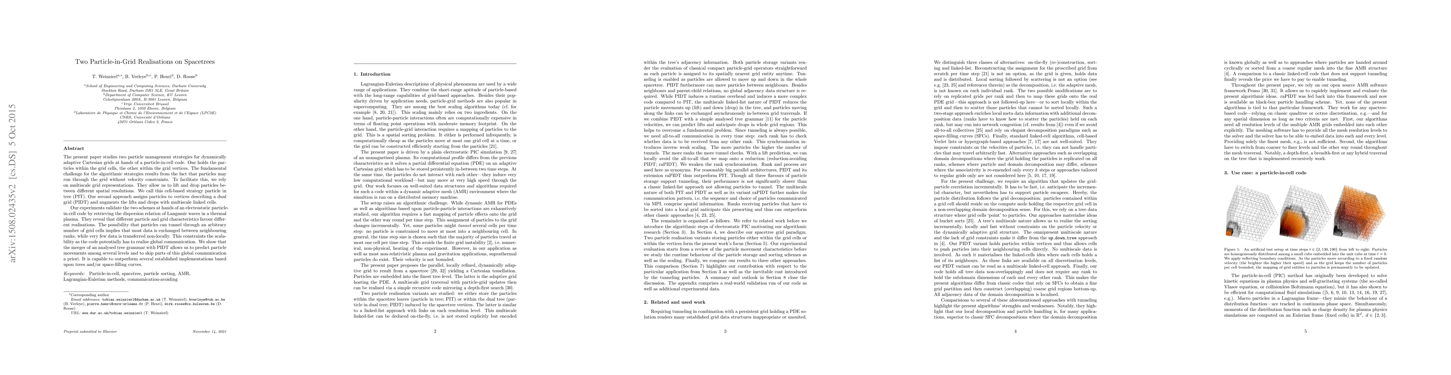 The present paper studies two particle management strategies for dynamically adaptive Cartesian grids at hands of a particle-in-cell code. One holds the particles within the grid cells, the other within the grid vertices. The fundamental challenge for the algorithmic strategies results from the fact that particles may run through the grid without velocity constraints. To facilitate this, we rely on multiscale grid representations. They allow us to lift and drop particles between different spatial resolutions. We call this cell-based strategy particle in tree (PIT). Our second approach assigns particles to vertices describing a dual grid (PIDT) and augments the lifts and drops with multiscale linked cells. Our experiments validate the two schemes at hands of an electrostatic particle-in-cell code by retrieving the dispersion relation of Langmuir waves in a thermal plasma. They reveal that different particle and grid characteristics favour different realisations. The possibility that particles can tunnel through an arbitrary number of grid cells implies that most data is exchanged between neighbouring ranks, while very few data is transferred non-locally. This constraints the scalability as the code potentially has to realise global communication. We show that the merger of an analysed tree grammar with PIDT allows us to predict particle movements among several levels and to skip parts of this global communication a priori. It is capable to outperform several established implementations based upon trees and/or space-filling curves.