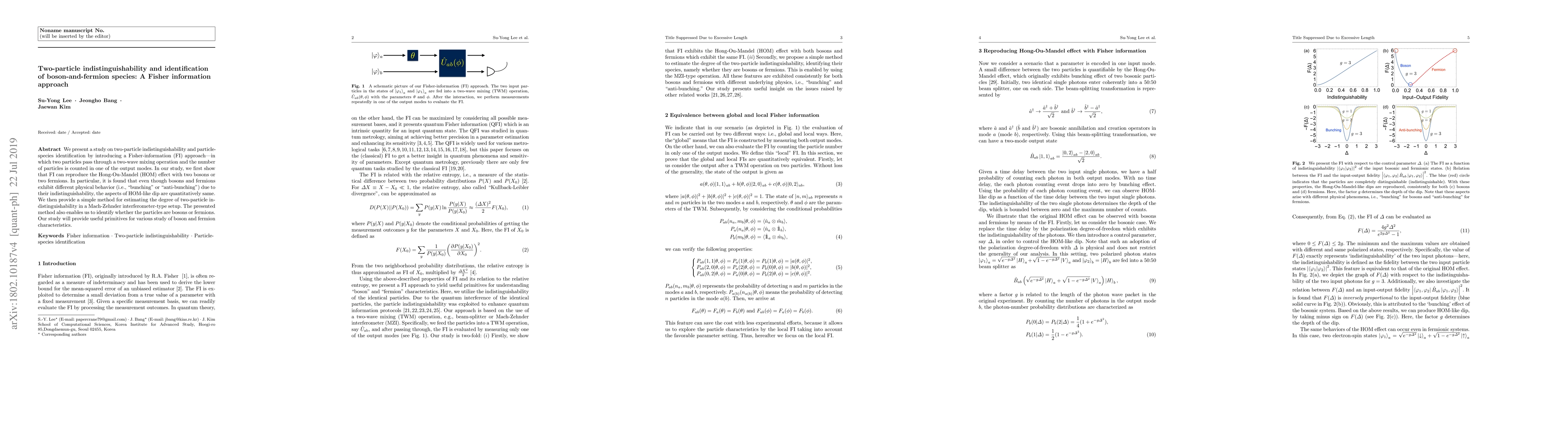 This paper introduces a Fisher information approach to study two-particle indistinguishability and identify boson-and-fermion species, showing that it can reproduce the Hong-Ou-Mandel effect and provide a method to distinguish between bosons and fermions in a Mach-Zehnder interferometer setup.