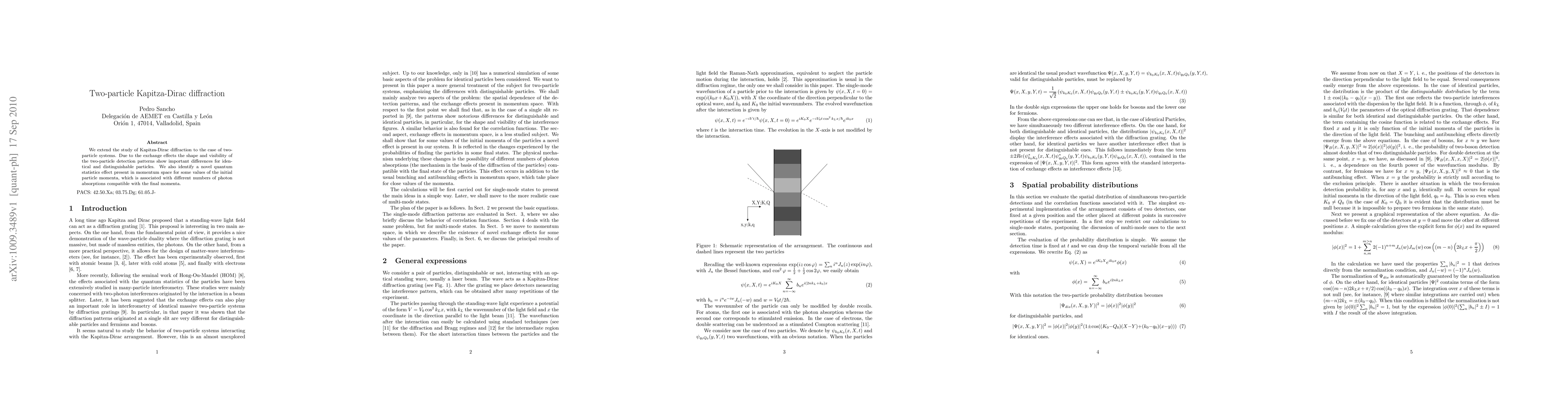 This paper explores Kapitza-Dirac diffraction in two-particle systems, revealing that exchange effects significantly alter the detection patterns for identical versus distinguishable particles. Additionally, it identifies a new quantum statistics effect in momentum space linked to varying photon absorptions for specific initial momenta.