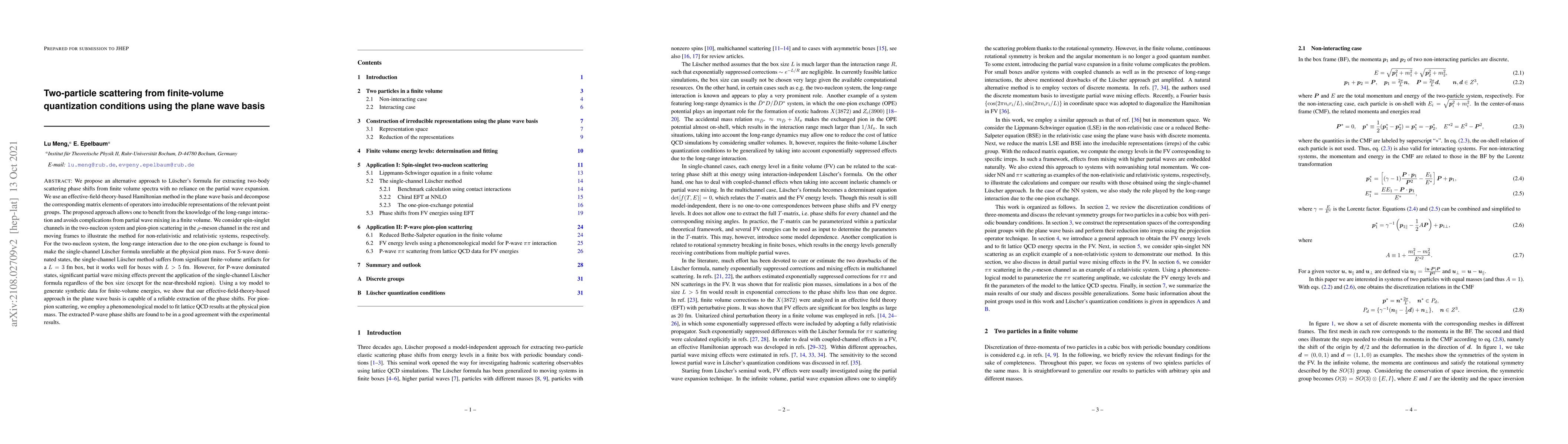 This paper proposes an alternative method to L\"uscher's formula for extracting two-body scattering phase shifts from finite volume spectra using an effective-field-theory-based Hamiltonian in the plane wave basis, avoiding partial wave mixing complications. The method is successfully applied to two-nucleon and pion-pion scattering, showing better reliability than the single-channel L\"uscher formula, especially for P-wave dominated states.