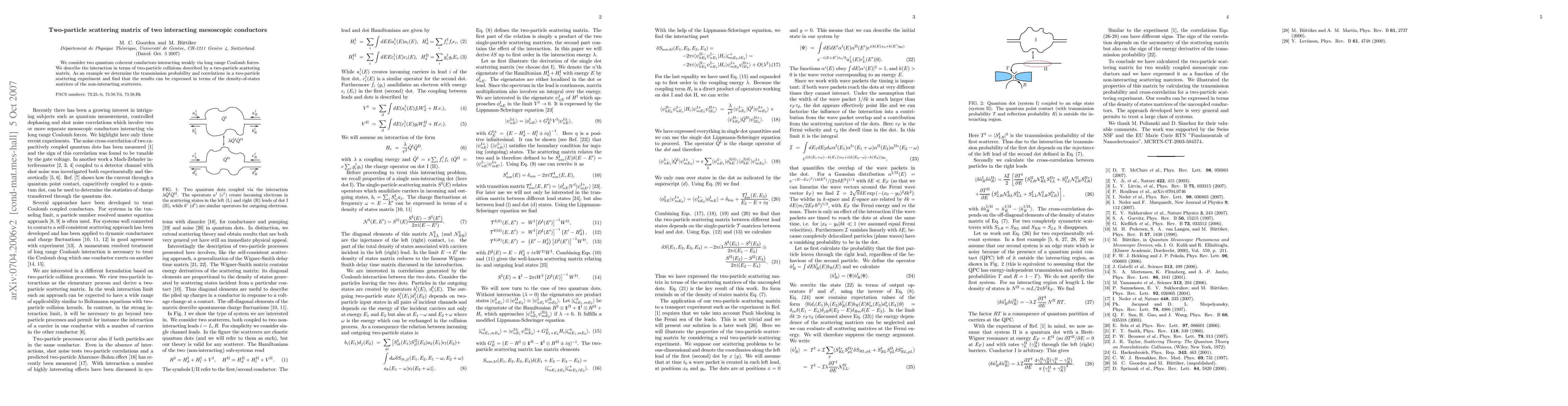 Researchers studied how two interacting mesoscopic conductors behave when particles collide, finding that their interactions can be described using non-interacting scatterer density-of-states matrices.
