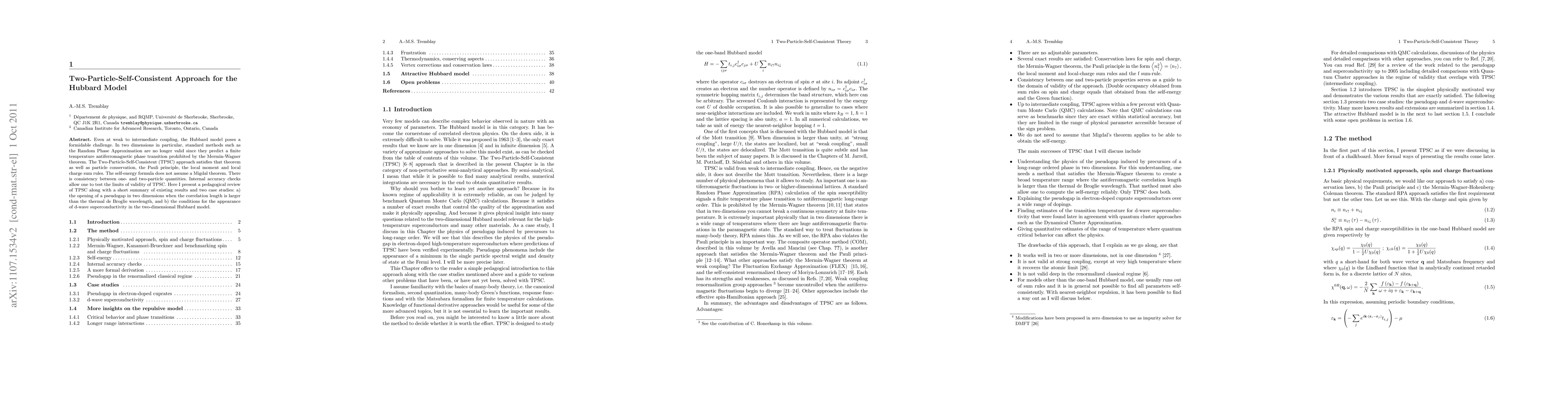 This paper reviews the Two-Particle-Self-Consistent (TPSC) approach to the Hubbard model, emphasizing its ability to accurately describe two-dimensional systems without violating the Mermin-Wagner theorem. It includes case studies on pseudogap formation and d-wave superconductivity conditions.