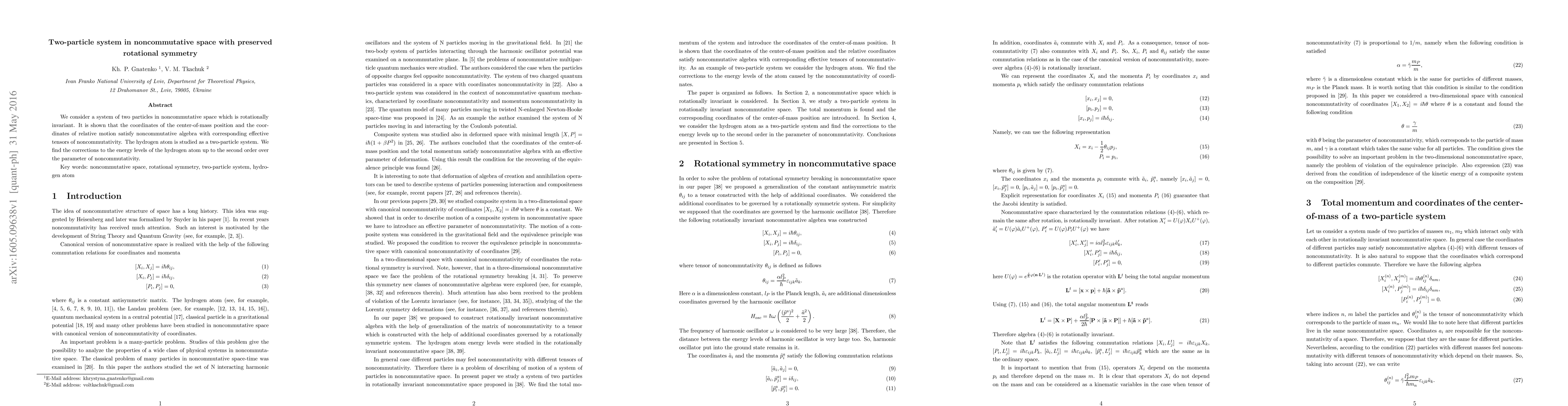 The paper investigates a two-particle system in a rotationally invariant noncommutative space, demonstrating noncommutative algebra for center-of-mass and relative motion. The hydrogen atom is analyzed, revealing corrections to its energy levels up to the second order in the noncommutativity parameter.