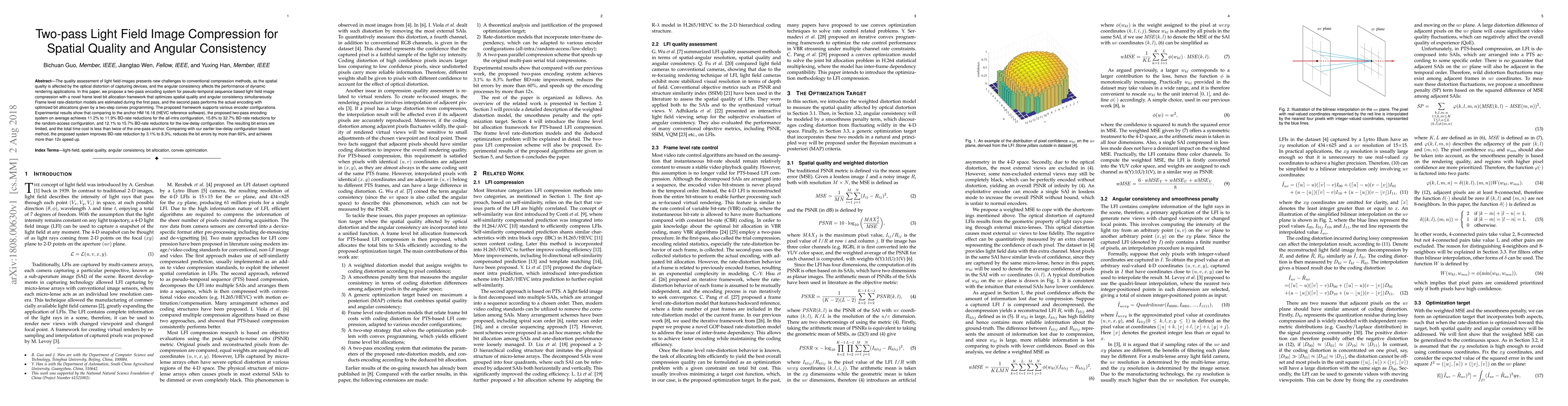 A new two-pass image compression system improves light field image quality while maintaining angular consistency, achieving 11-32% BD-rate reductions and up to 12x speedup over existing methods.