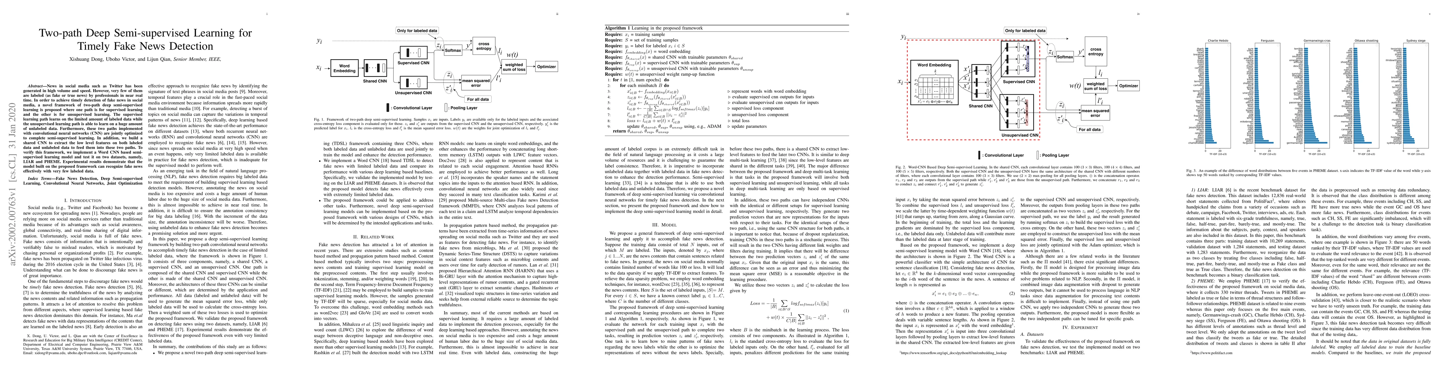 The paper proposes a two-path deep semi-supervised learning framework for timely detection of fake news on social media, combining supervised learning on limited labeled data and unsupervised learning on vast unlabeled data using convolutional neural networks (CNN). Experimental results on LIAR and PHEME datasets show effective fake news recognition with minimal labeled data.