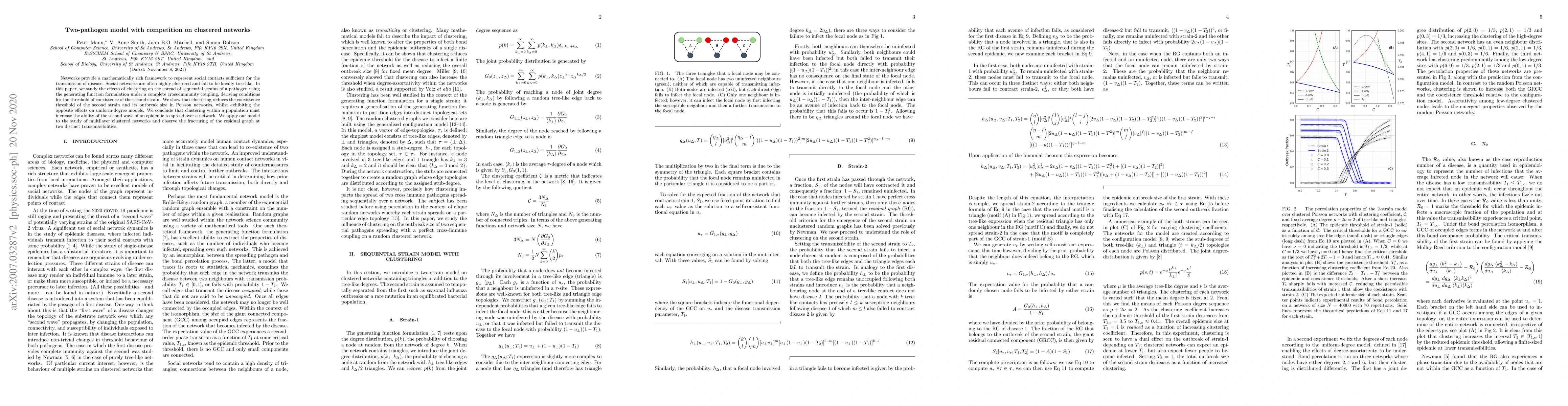 Networks provide a mathematically rich framework to represent social contacts sufficient for the transmission of disease. Social networks are often highly clustered and fail to be locally tree-like. In this paper, we study the effects of clustering on the spread of sequential strains of a pathogen using the generating function formulation under a complete cross-immunity coupling, deriving conditions for the threshold of coexistence of the second strain. We show that clustering reduces the coexistence threshold of the second strain and its outbreak size in Poisson networks, whilst exhibiting the opposite effects on uniform-degree models. We conclude that clustering within a population must increase the ability of the second wave of an epidemic to spread over a network. We apply our model to the study of multilayer clustered networks and observe the fracturing of the residual graph at two distinct transmissibilities.