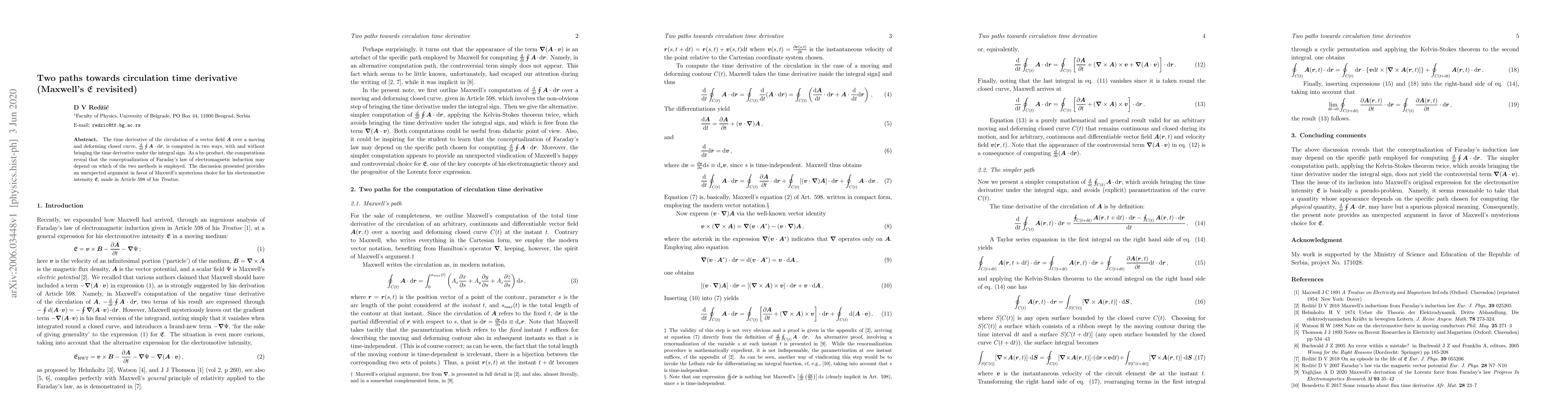 The time derivative of the circulation of a vector field $\boldsymbol{A}$ over a moving and deforming closed curve, $\frac {\mathrm{d}}{\mathrm{d} t}\oint \boldsymbol{A} \cdot \mathrm{d} \boldsymbol{r}$, is computed in two ways, with and without bringing the time derivative under the integral sign. As a by-product, the computations reveal that the conceptualization of Faraday's law of electromagnetic induction may depend on which of the two methods is employed. The discussion presented provides an unexpected argument in favor of Maxwell's mysterious choice for his electromotive intensity $\mathfrak E$, made in Article 598 of his Treatise.