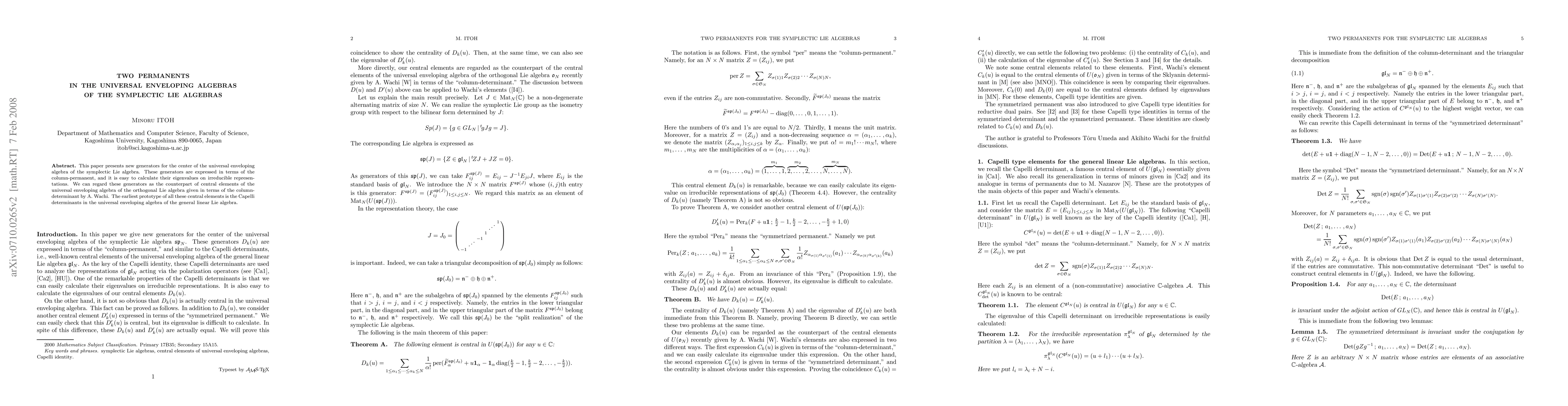 This paper presents new generators for the center of the universal enveloping algebra of the symplectic Lie algebra. These generators are expressed in terms of the column-permanent, and it is easy to calculate their eigenvalues on irreducible representations. We can regard these generators as the counterpart of central elements of the universal enveloping algebra of the orthogonal Lie algebra given in terms of the column-determinant by A. Wachi. The earliest prototype of all these central elements is the Capelli determinants in the universal enveloping algebra of the general linear Lie algebra.