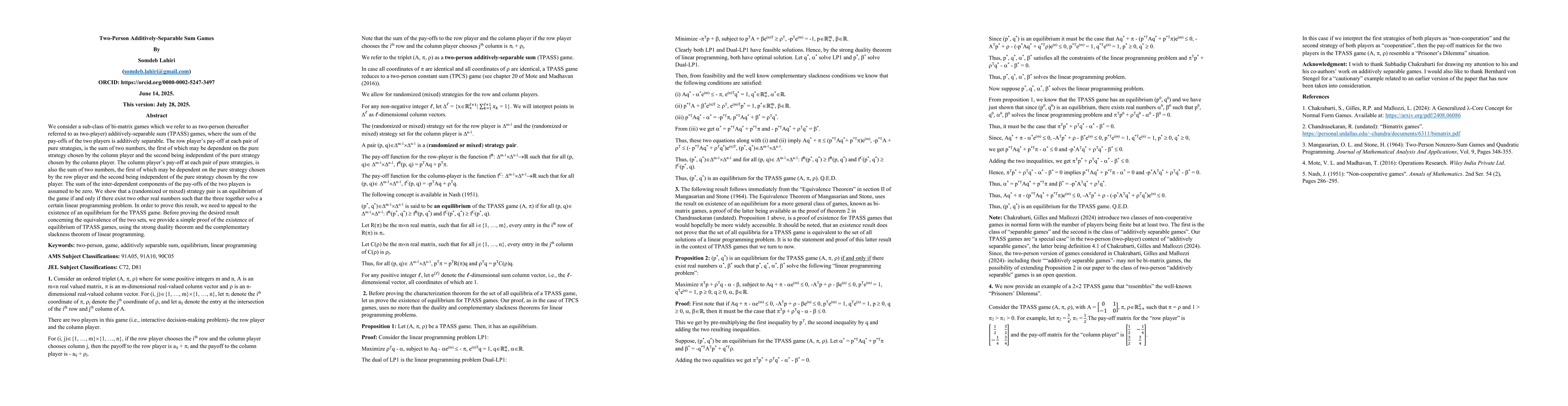 We consider a subclass of bimatrix games which we refer to as two person additively separable sum games, where the sum of the payoffs of the two players is additively separable. The payoff to the row player at each pair of pure strategies, is the sum of two numbers, the first of which may be dependent on the pure strategy chosen by the column player and the second being independent of the pure strategy chosen by the column player. The payoff to the column player at each pair of pure strategies, is also the sum of two numbers, the first of which may be dependent on the pure strategy chosen by the row player and the second being independent of the pure strategy chosen by the row player. The sum of the interdependent components of the payoffs of the two players is assumed to be zero. We show that a randomized or mixed strategy pair is an equilibrium of the game if and only if there exist two other real numbers such that the three together solve a certain linear programming problem. In order to prove this result, we need to appeal to the existence of an equilibrium for the two person additively separable sum game. Before proving the desired result concerning the equivalence of the two sets, we provided a simple proof of the existence of equilibrium for two person additively separable sum games, using the strong duality theorem and the complementary slackness theorem of linear programming.