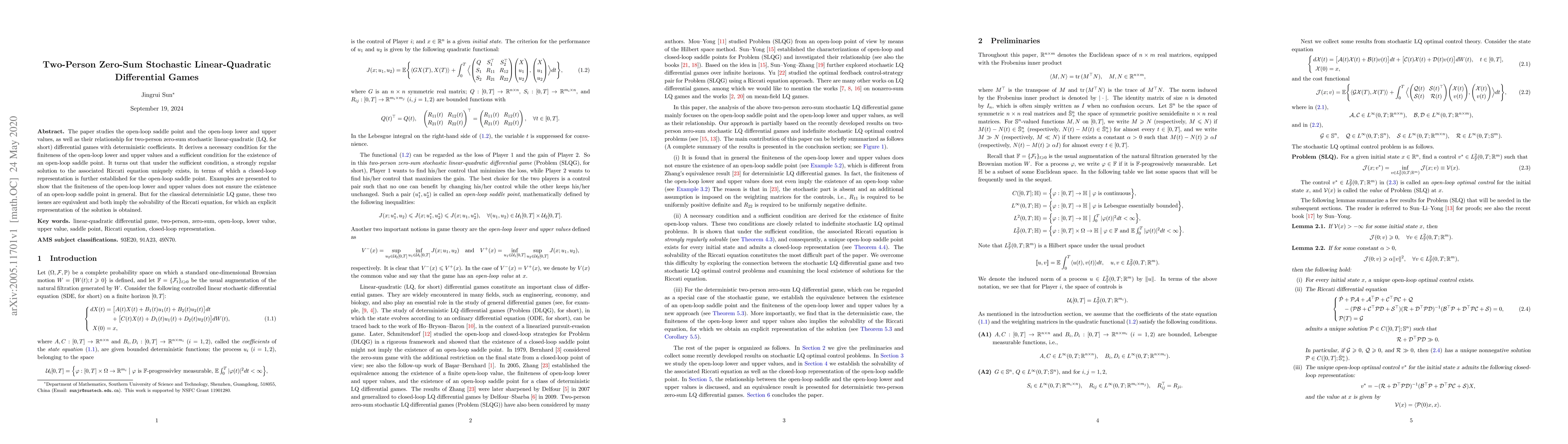 This paper explores two-person zero-sum stochastic linear-quadratic differential games, deriving conditions for the finiteness of open-loop values and the existence of an open-loop saddle point, and establishing a closed-loop representation linked to a strongly regular Riccati equation. It highlights that while finiteness of open-loop values does not generally imply a saddle point, these conditions are equivalent in classical deterministic LQ games.